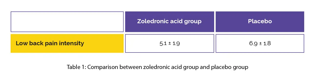 In the zoledronic acid group, the low back pain intensity was reduced at four-weeks when compared to placebo (minimal clinically important difference [MCID] = 1.5), as shown in Table 1: