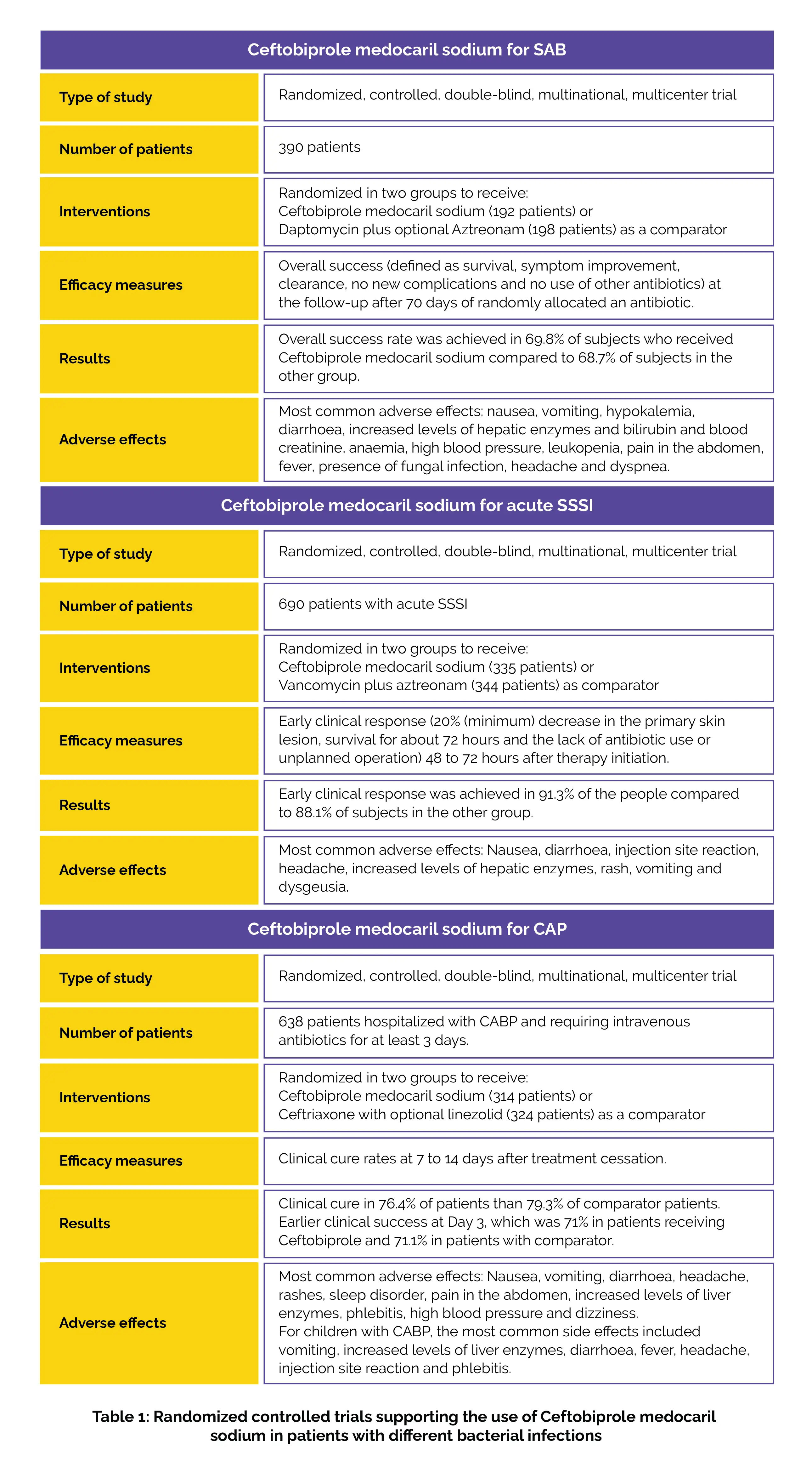 Ceftobiprole medocaril sodium injection is effective for 3 acute bacterial infections.
