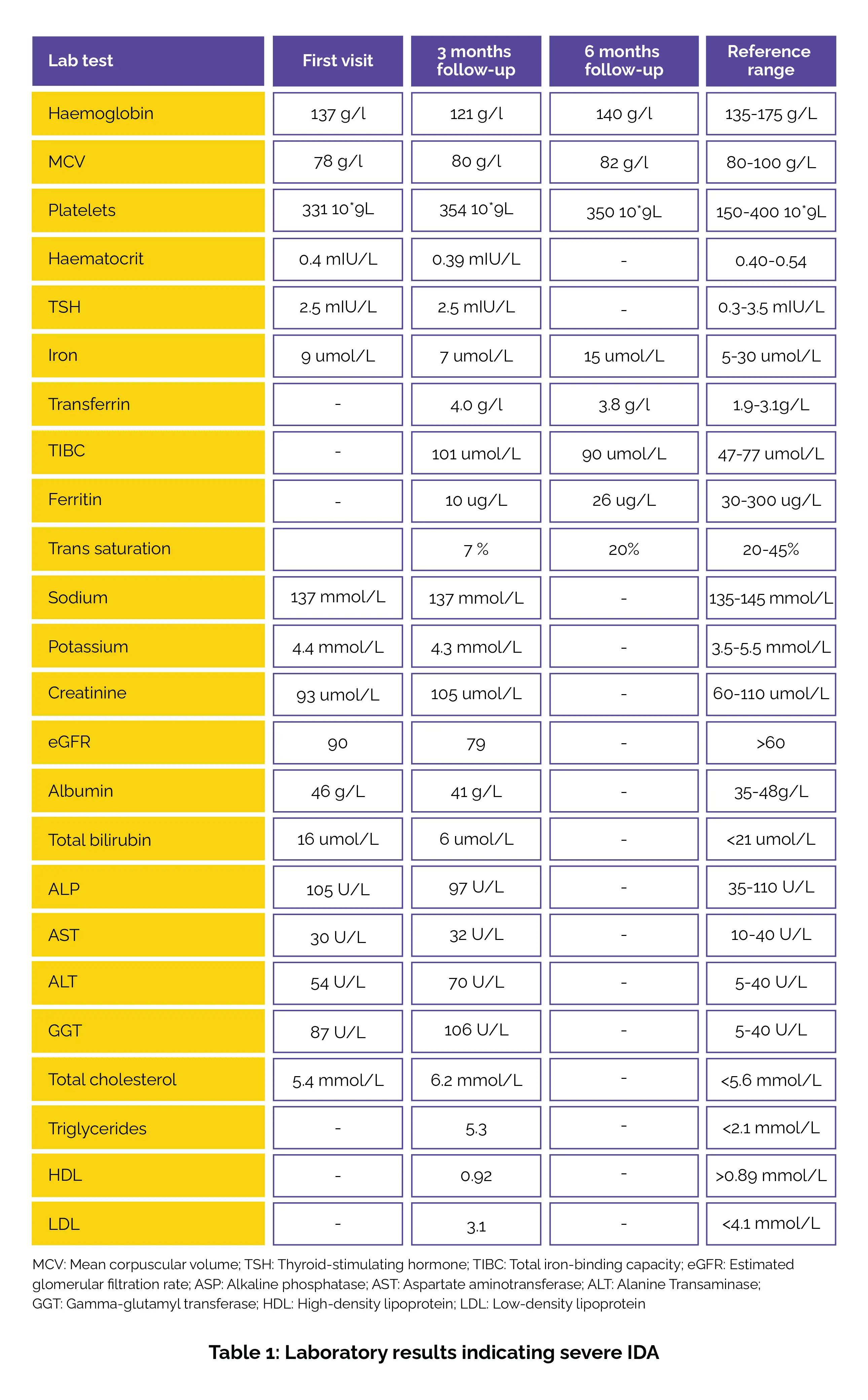 Iron studies revealed low serum iron (9 µmol/L) and a transferrin saturation of just 7%, both indicating a significant iron deficiency. Elevated transferrin (4.0 g/L) and TIBC at 101 µmol/L further confirmed the deficiency. The patient also presented with moderate dyslipidaemia, with total cholesterol at 6.2 mmol/L (elevated), triglycerides at 5.3 mmol/L (elevated), and low HDL at 0.92 mmol/L, which are risk factors for cardiovascular disease.