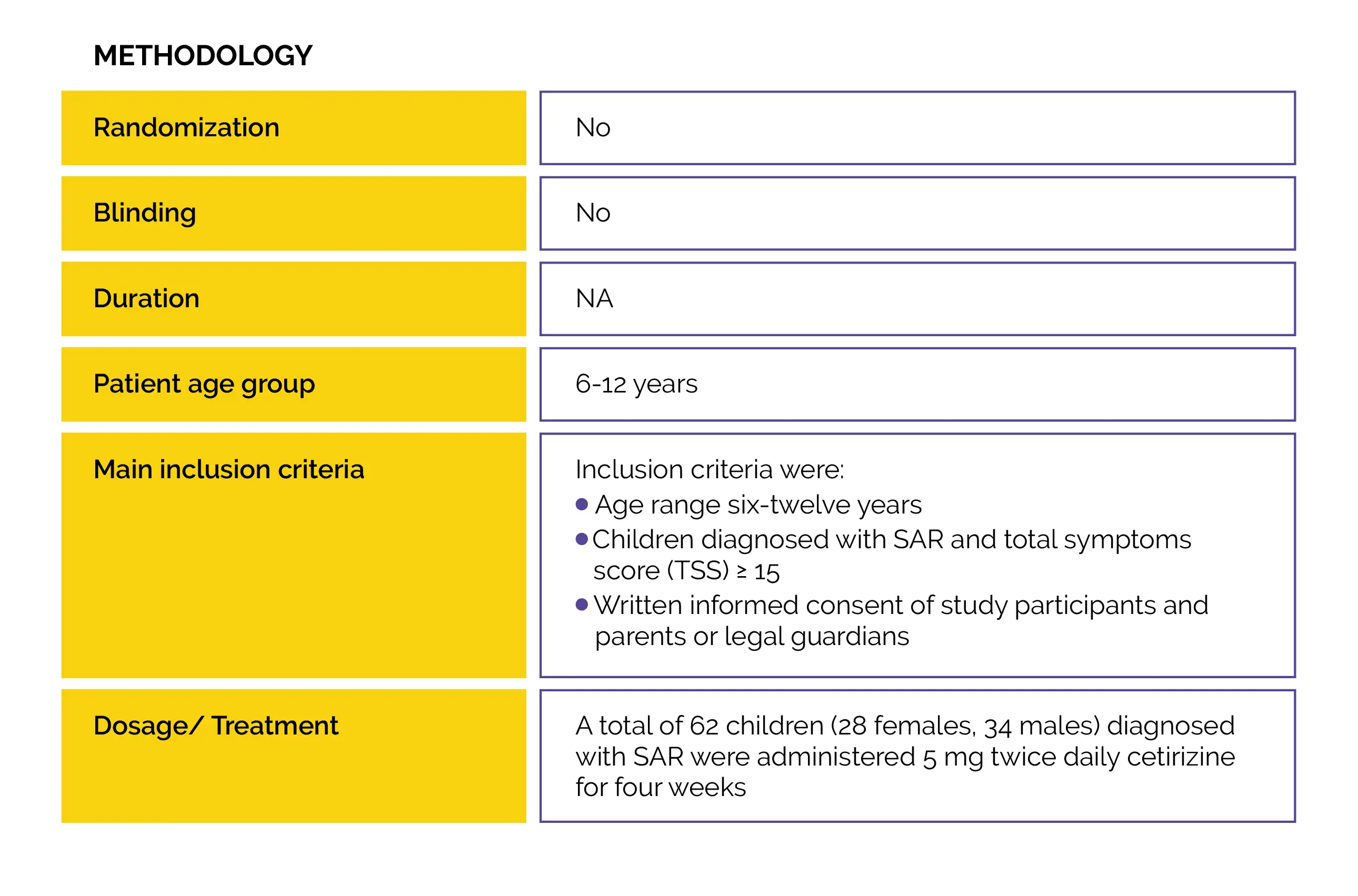 This pilot study enrolled 62 Italian children diagnosed with SAR. The recruited participants were given 5 mg twice daily cetirizine for four weeks. Notably, 2 visits were conducted: Visit 1 at baseline and Visit 2 after four weeks, i.e., end of therapy. It was found that long term continuous cetirizine therapy led to remarkable improvements in quality of life and mitigation in the severity of SAR symptoms.