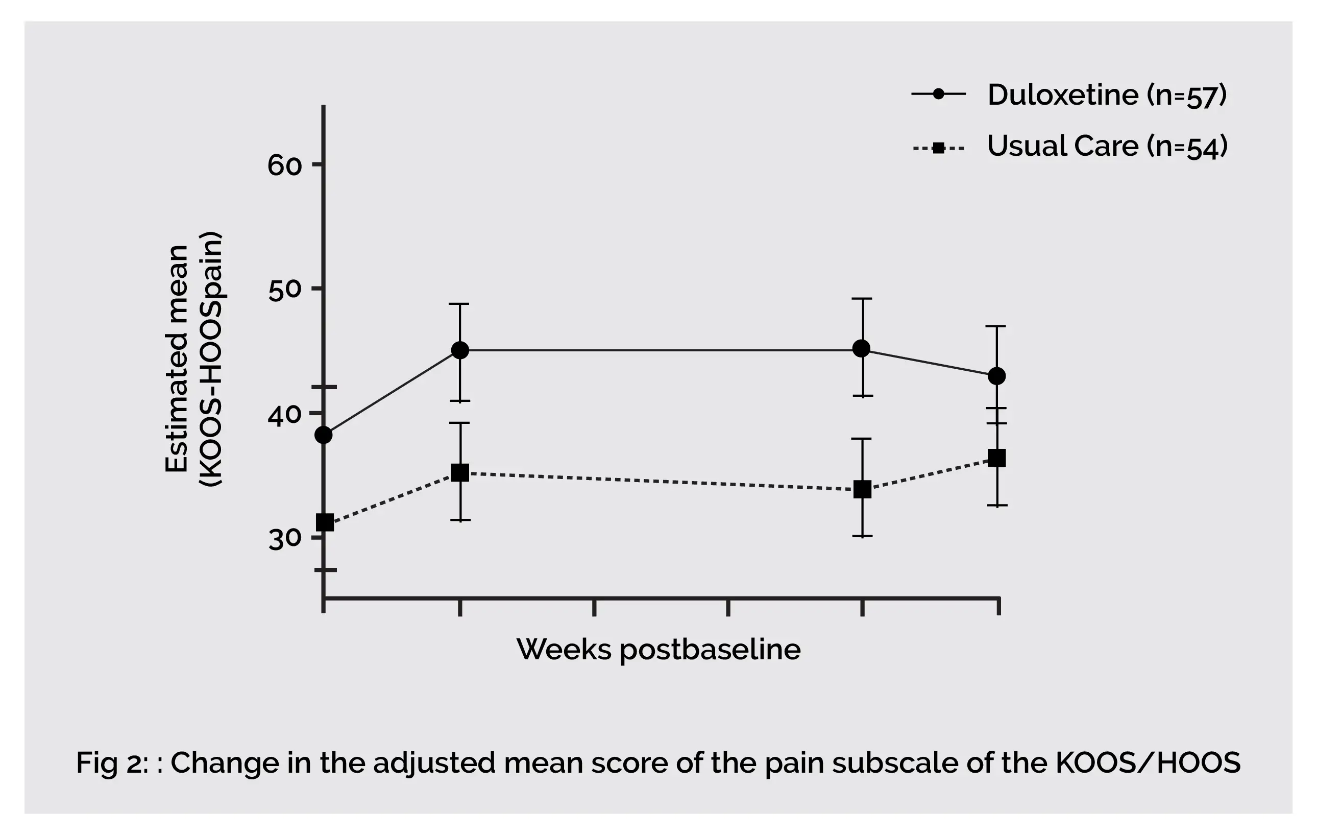 • Subjects in duloxetine group scored 11.3 points better on pain domain of KOOS/HOOS (Figure 1).