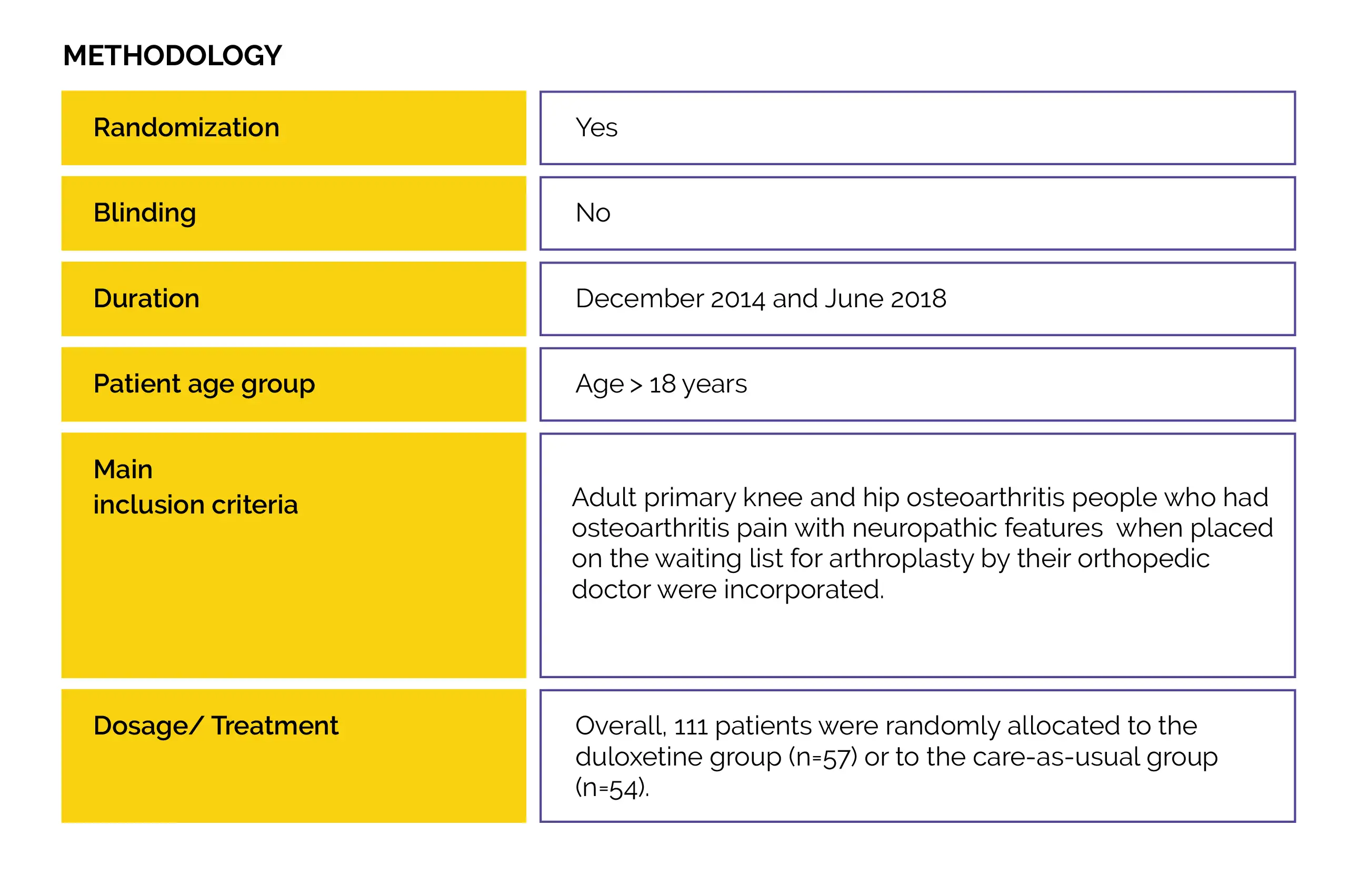 In people having knee osteoarthritis, the placebo-controlled randomized studies have demonstrated duloxetine's efficacy as a promising analgesic in the conservative therapeutic phase of osteoarthritis. But, there is a lack of far studies among hip osteoarthritis patients. Furthermore, all the previous knee osteoarthritis studies were placebo-controlled and hence did not incorporate a care-as-usual control situation. For enhancing external validity, pragmatic randomized trials are required.