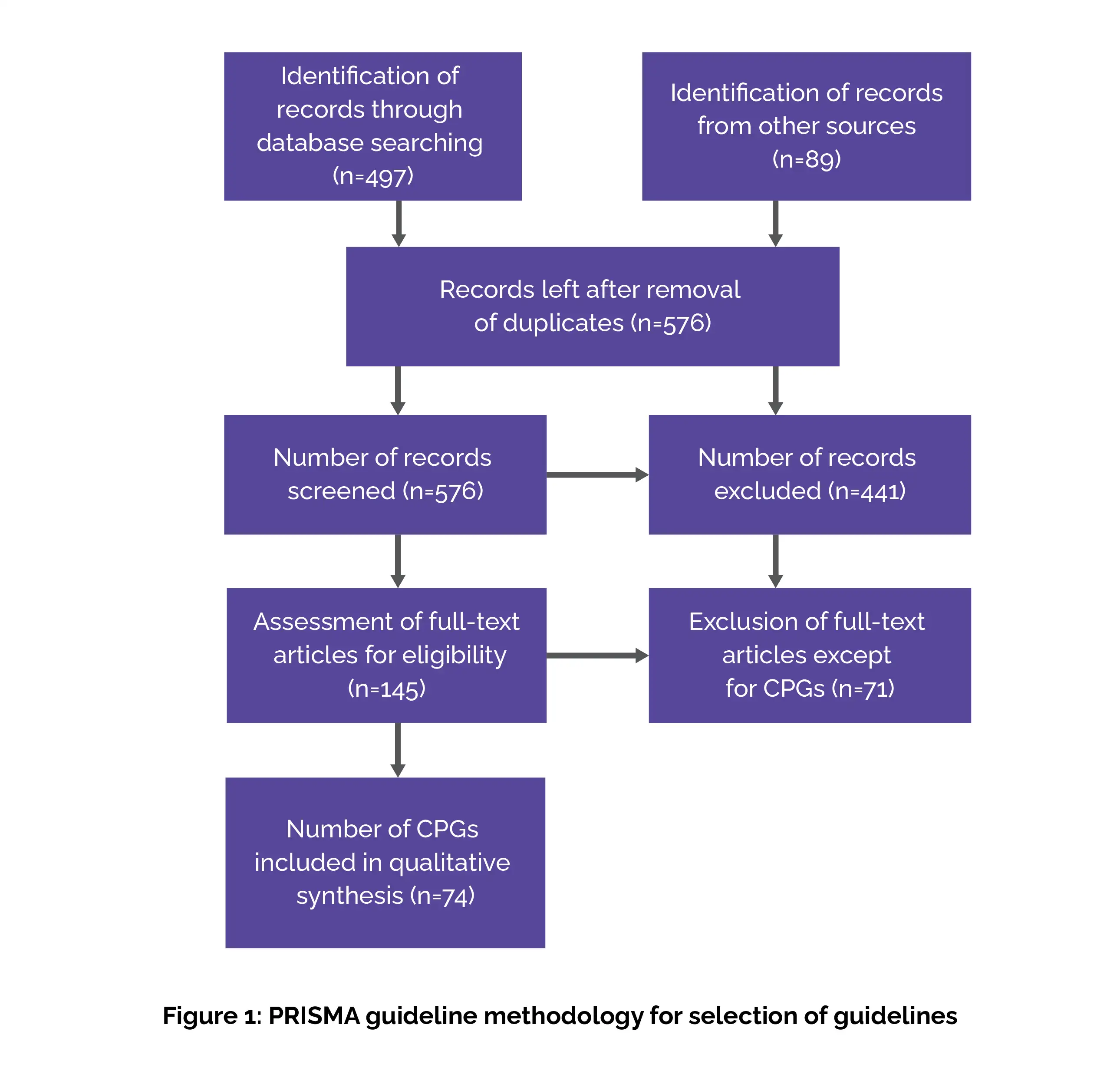 • After the identification of 586 documents, 441 were disregarded because they were duplicates or not relevant. The remaining records (145) were retrieved in full text, and 71 were eliminated since they weren't CPGs.