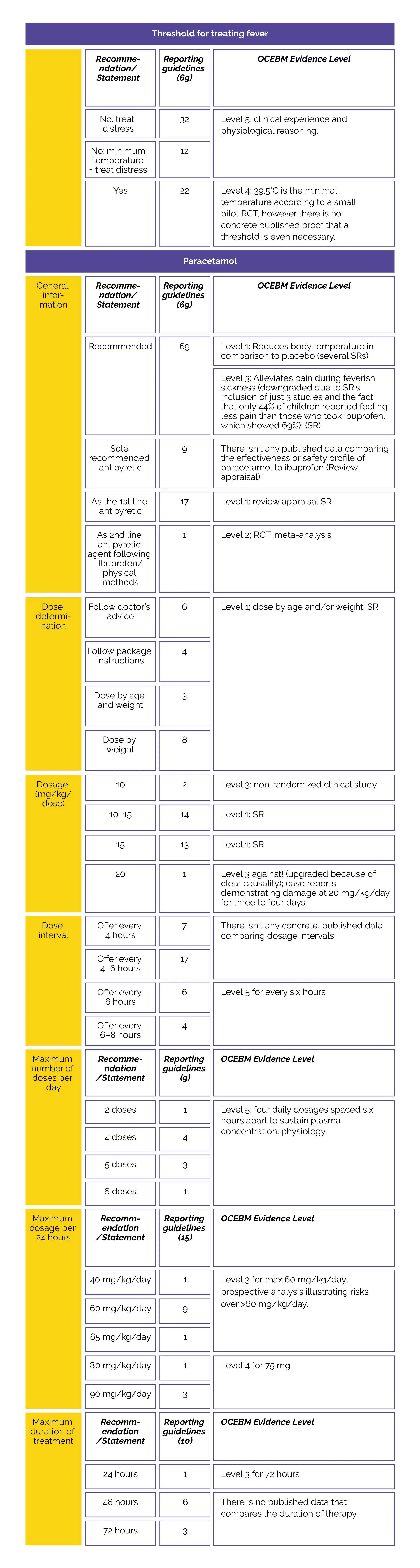 • All recommendations prescribe paracetamol as the only medicine, and 17 guidelines recommend it above ibuprofen. While they both work well to reduce body temperature, there is weaker evidence that they are also valuable in reducing distress.