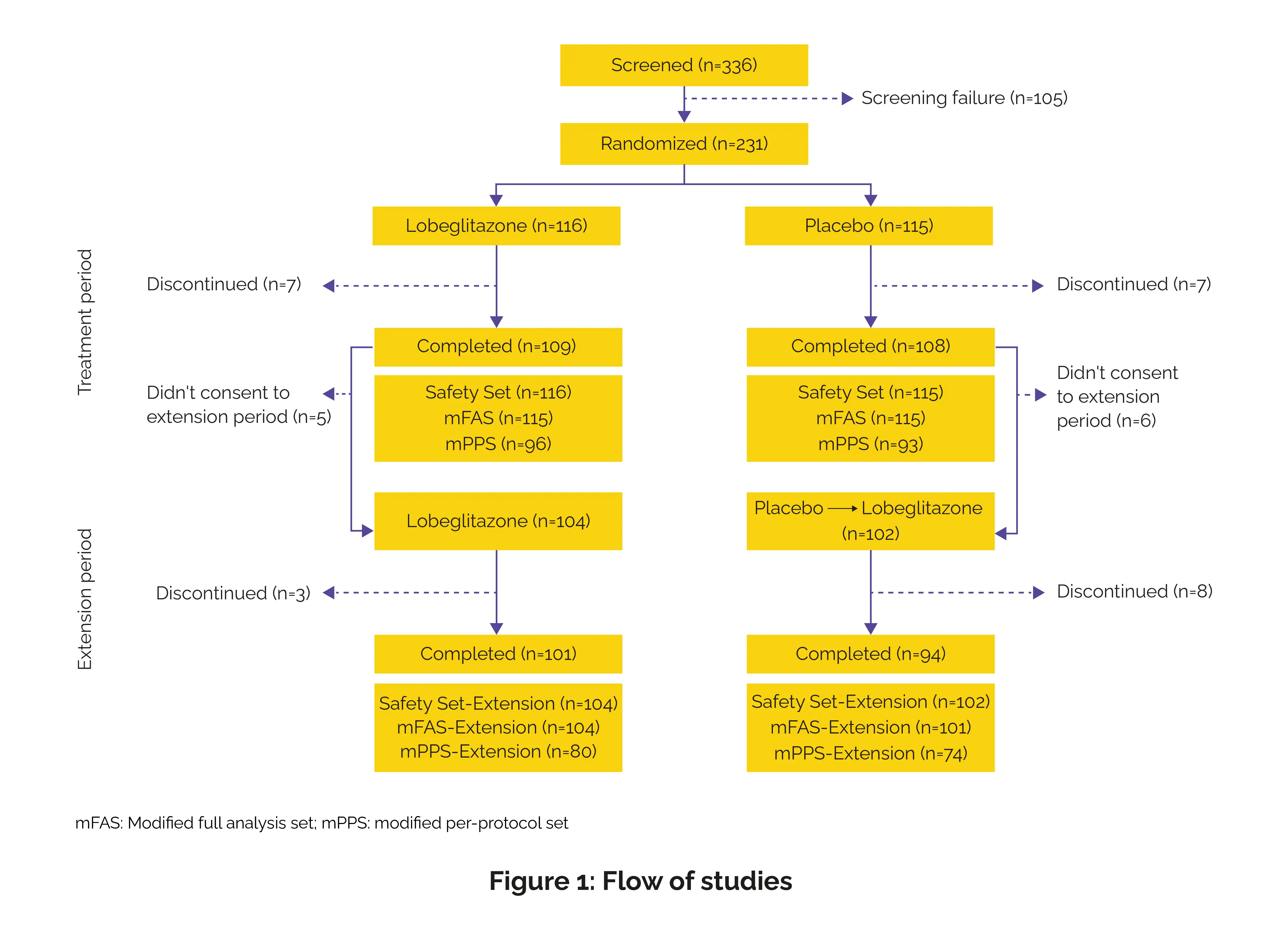 • Of 336 subjects screened, 231 were randomized to get either placebo (115 patients) or lobeglitazone 0.5 mg (116 patients). Overall, 217 subjects completed the treatment period, and 195 subjects continued through and completed the extension period.