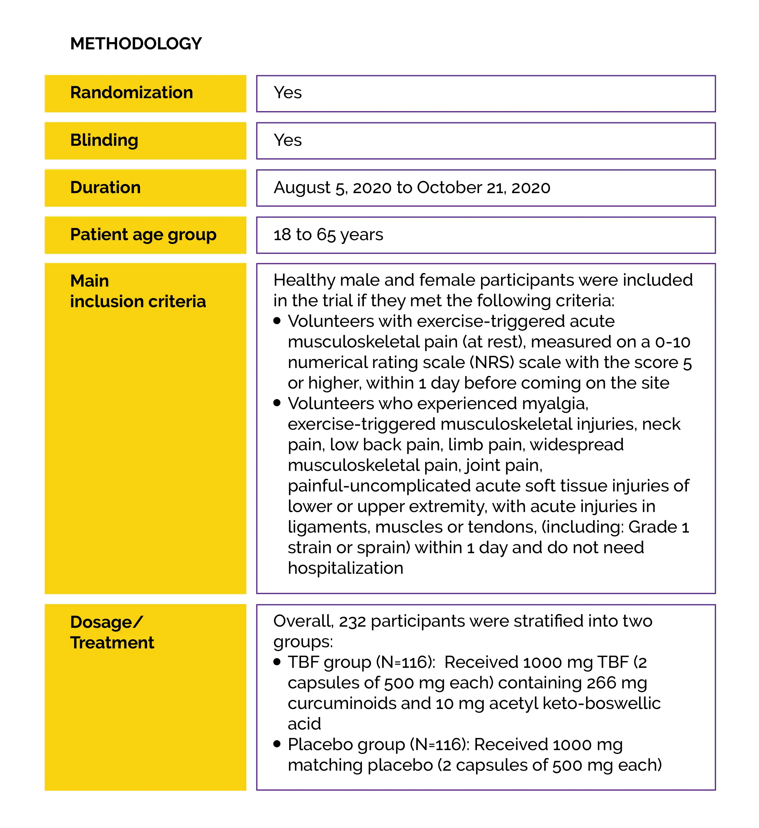 Turmeric-Boswellia formulation can effectively relieve exercise-induced acute musculoskeletal pain within 3 hours of administration.