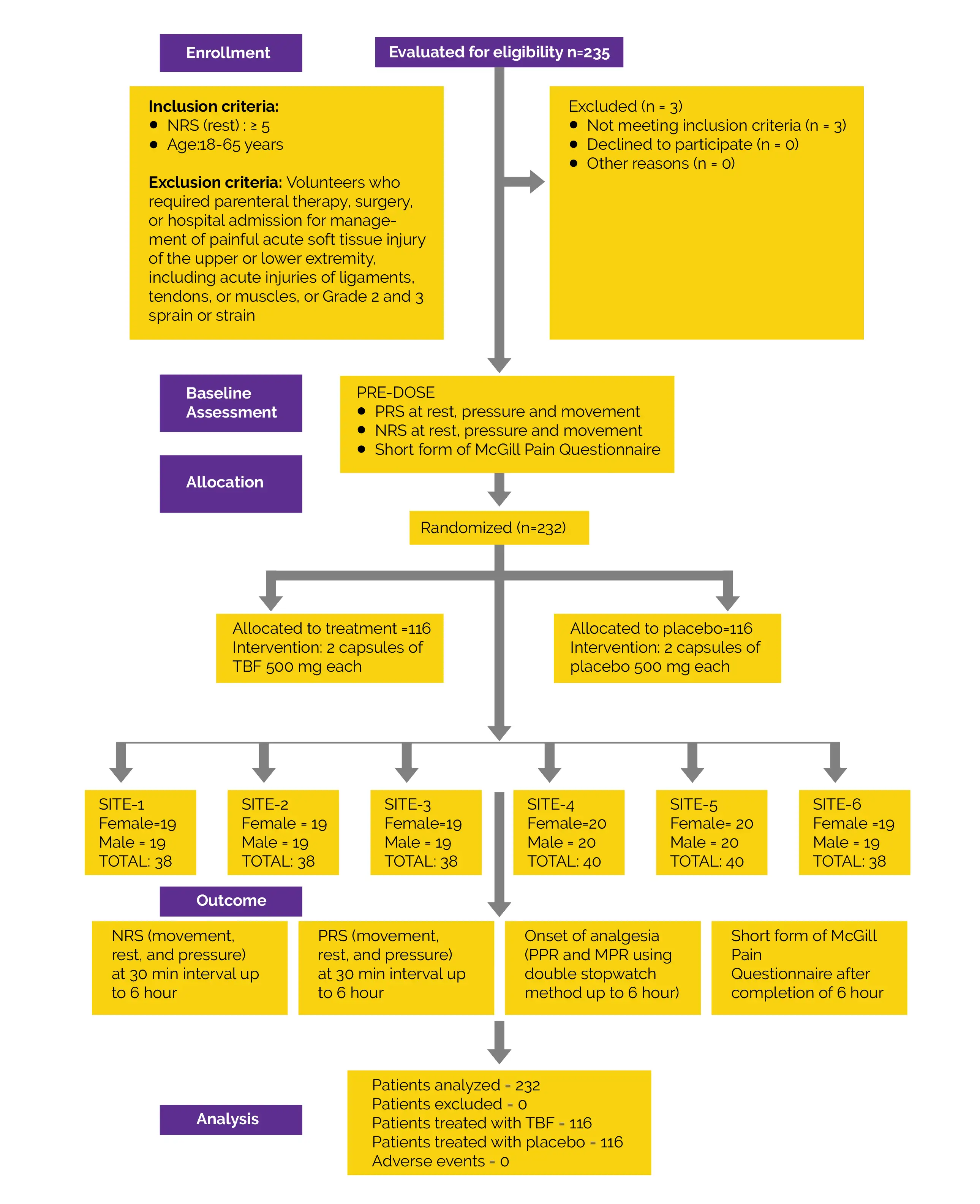 The current double-blind, placebo-controlled, multicenter study was designed to comprehend the impact of TBF on exercise-induced severe to moderate acute musculoskeletal pain and validate the results of the prior study using statistically significant sample sizes.