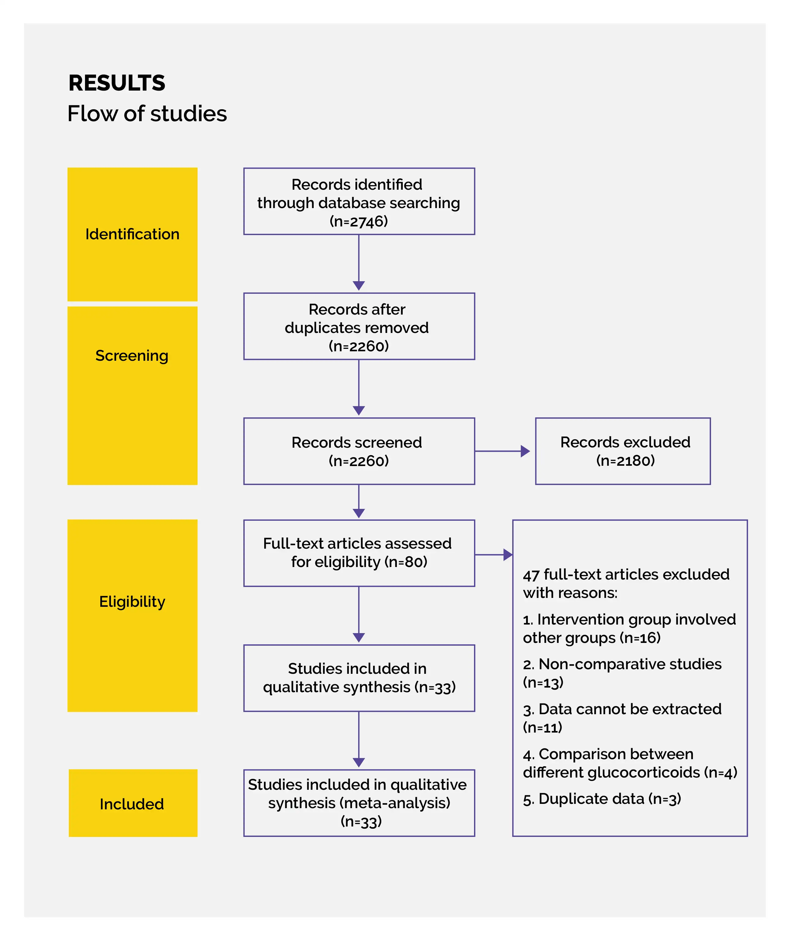 Recording of the following information from each eligible study was done: data required for quality evaluation, major endpoint and other study features, methylprednisolone prescription, population characteristics, study interval, study design, study location, and the first author’s name. Population characteristics incorporated mean age and sample size of both arms, along with the disease status of the patients enrolled in each study.