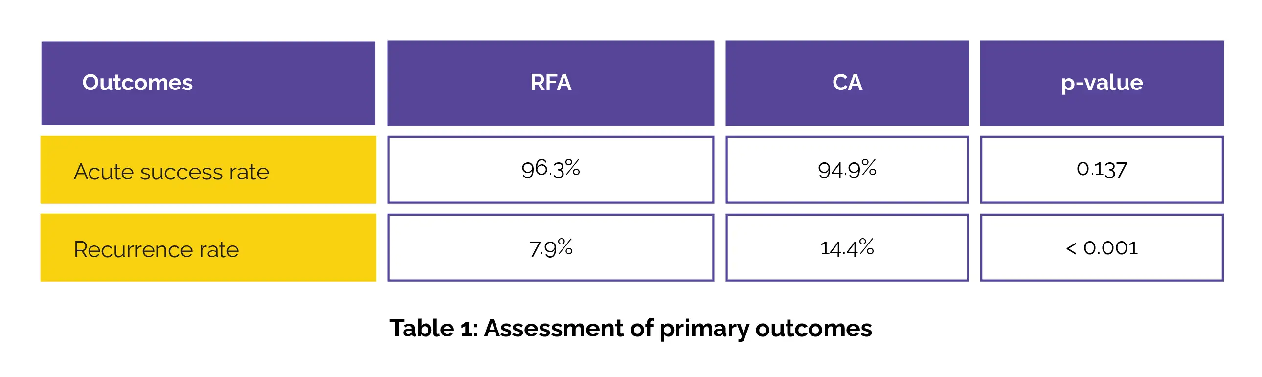 Acute success rates were high for both RFA and CA with no statistically significant difference. However, RFA was linked with a considerably lower recurrence rate (Table 1).