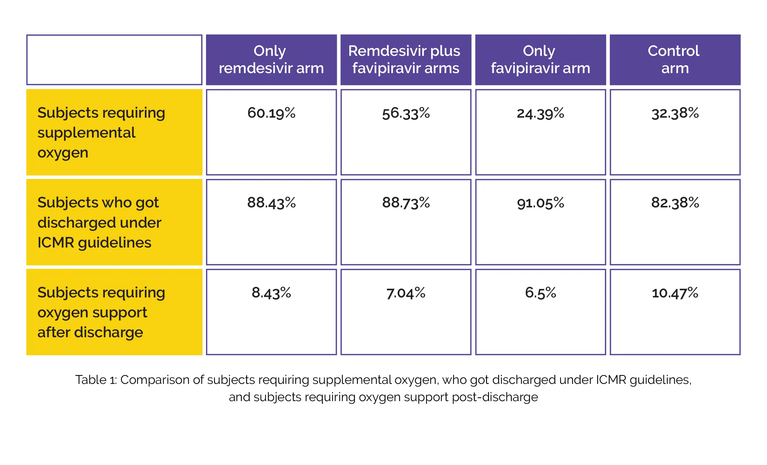 In hospitalized COVID-19 patients, treatment with favipiravir and/or remdesivir was associated with promising clinical outcomes like a reduction in the need for oxygen supplementation post-discharge and a higher proportion of subjects getting discharged under ICMR guidelines.