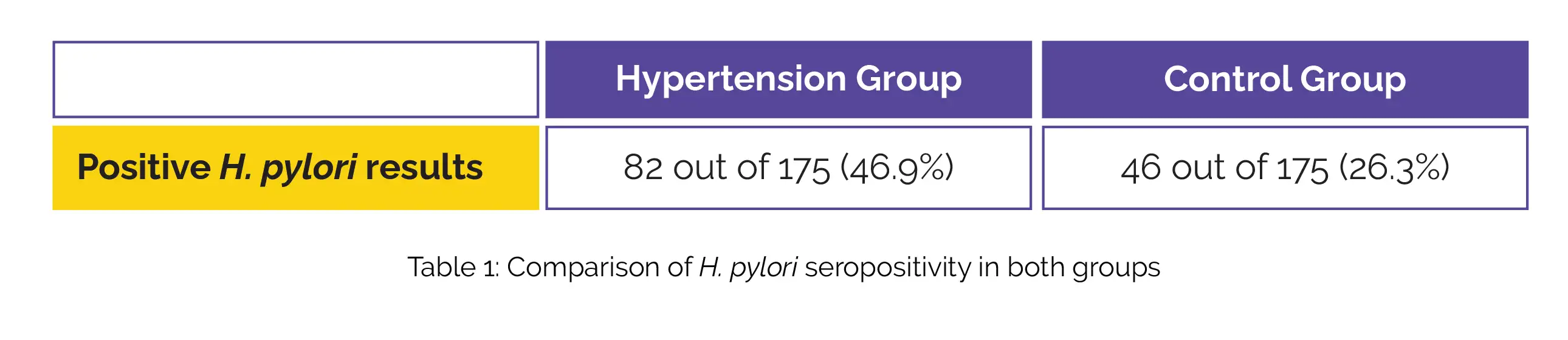 The study involved two groups: the hypertension group and the control group, each comprising 175 participants. The hypertension group encompassed people diagnosed with hypertension, while the control group consisted of people without hypertension. A questionnaire was utilized to gather participants' information. Additionally, rapid tests for H. pylori antibodies were administered, followed by binary and linear regression analyses.