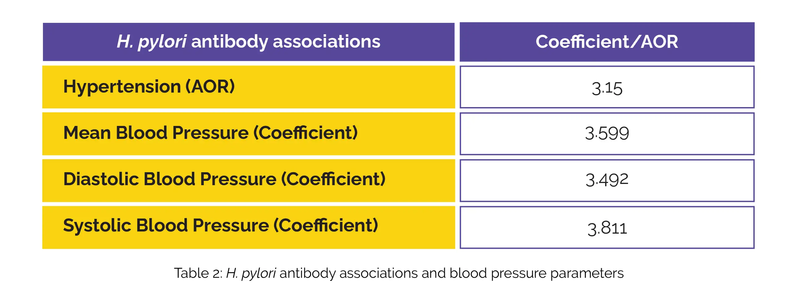 H. pylori seropositivity was linked to various aspects, including hypertension, mean blood pressure, diastolic blood pressure, and systolic blood pressure, as shown in Table 2: