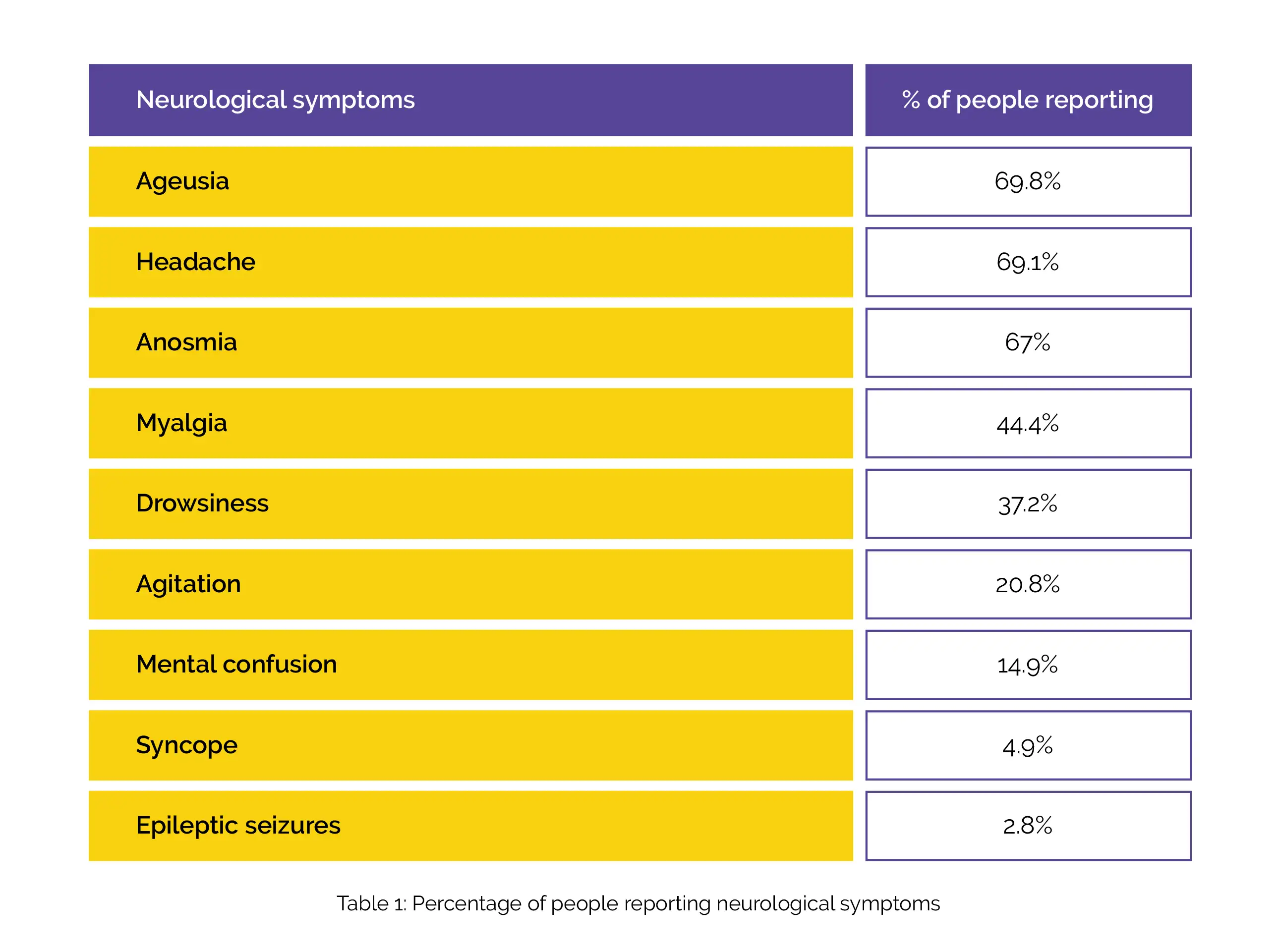 Out of the interviewed people, 91.7% had some neurological symptom; 22.2% had some neurological symptom as the symptom that perturbed them most during coronavirus outbreak. Table 1 shows the percentage of people reporting neurological symptoms: