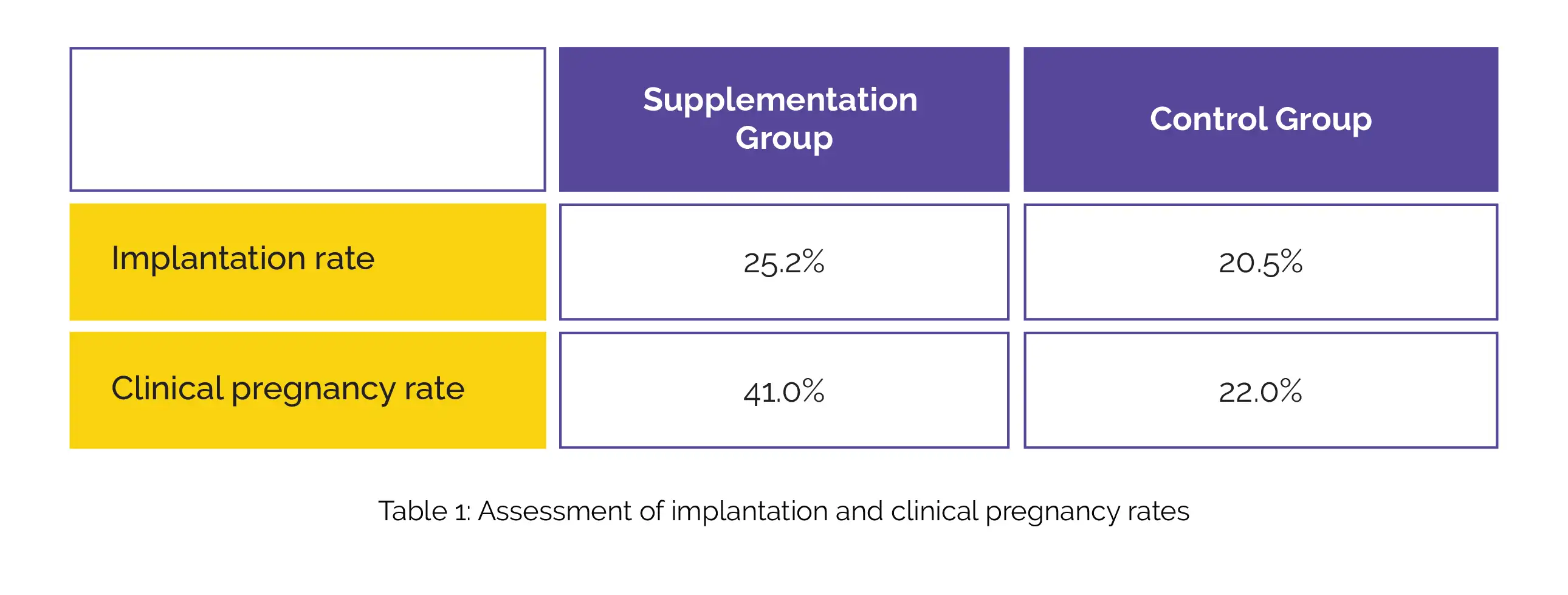 Patient and cycle characteristics were evenly distributed between both groups. As depicted in Table 1, the supplementation group exhibited substantially greater implantation rates and clinical pregnancy rates when compared to the control group.