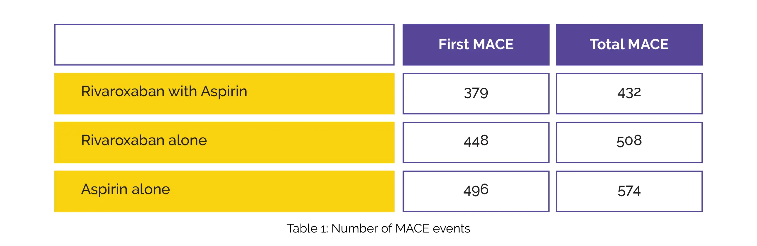 When compared to Aspirin alone, Rivaroxaban + Aspirin minimizes first and total MACE events by 24% and 25%, respectively in people with chronic coronary artery disease and/or peripheral artery disease.
