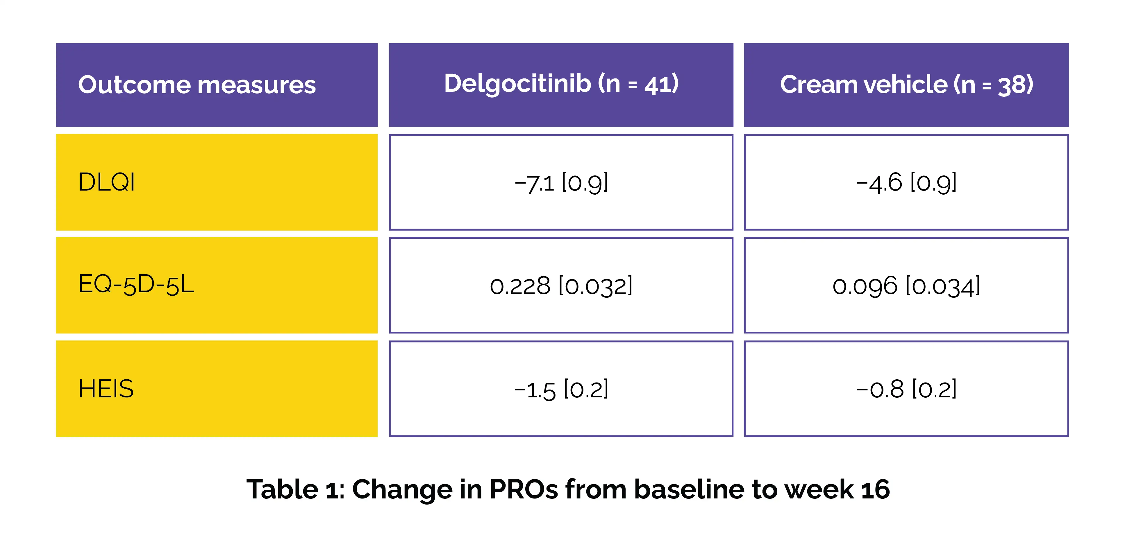 In this study, CHE-affected individuals were treated with either delgocitinib cream—a topical pan-Janus kinase (JAK) inhibitor—or a placebo cream. Initially, the Dermatology Life Quality Index (DLQI), EuroQol 5-Dimension 5-Level (EQ-5D-5L), and Hand Eczema Impact Scale (HEIS) scores were assessed at the time of screening procedure by disease intensity. Subsequently, PROs were determined in a subgroup of volunteers with moderate-to-severe CHE. Changes over 16 weeks in those treated with delgocitinib 20 mg/g cream were compared to those receiving placebo.