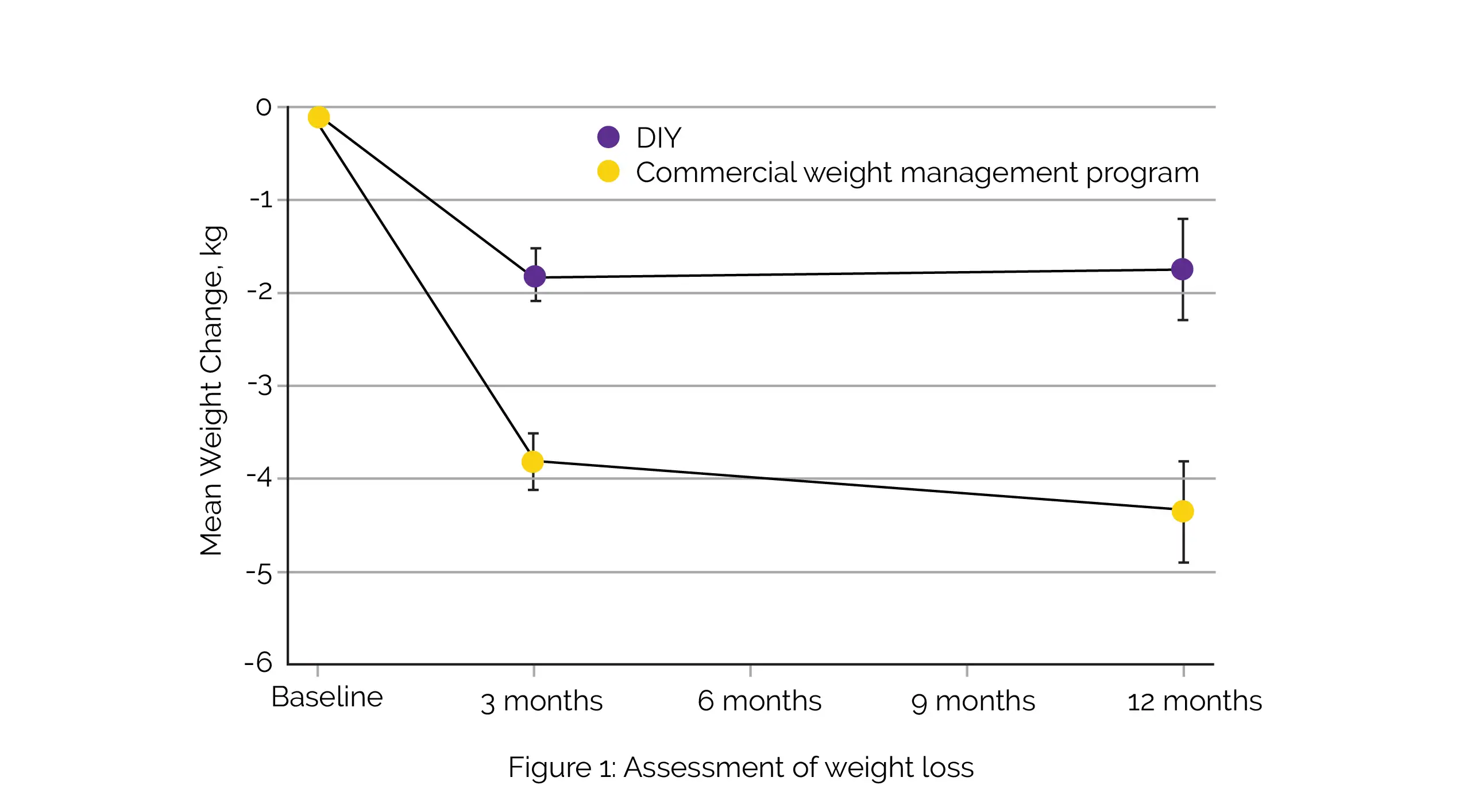 Adults who were randomly allocated to a commercial weight loss program reported greater weight loss and were more probable to lose 5% of their body weight at 3 and 12 months than adults on Do-It-Yourself approach.
