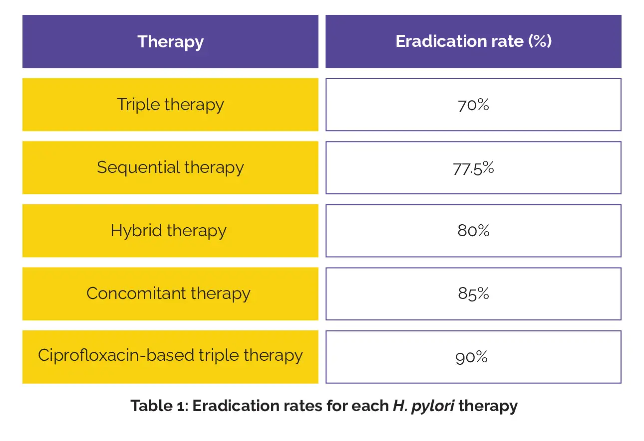 This trial compared the safety and efficacy of five main interventions used for H. pylori: triple-drug combination regimen, ciprofloxacin-based triple therapy, sequential therapy, hybrid (combined) therapy, and concomitant therapy.