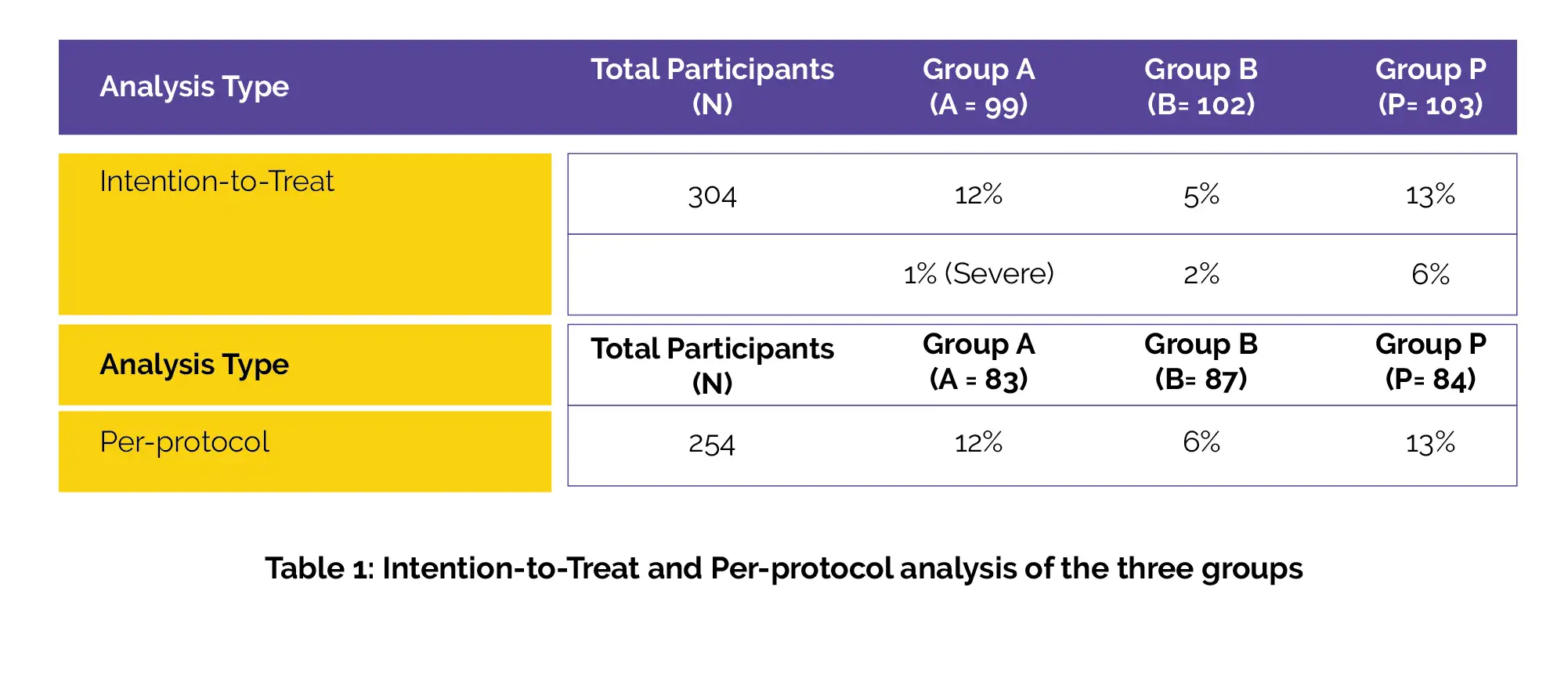 The relative risk of developing AMS compared to placebo was A-0.96 (p = 0.91), B-0.39 (p = 0.06) by IT analysis, and A-0.94 (p = 0.88), B-0.45 (p = 0.12) by PP analysis.