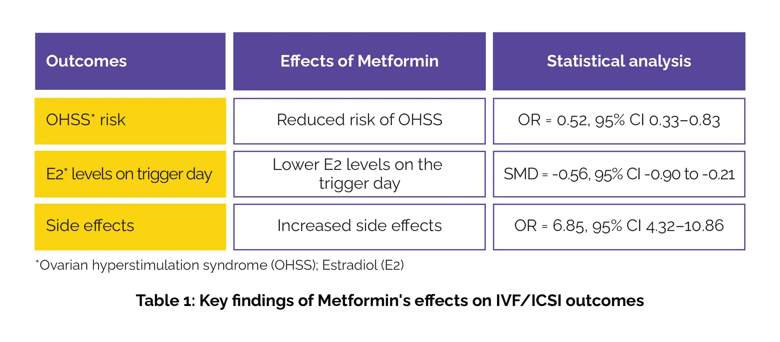 Also, Metformin was linked to lower E2 levels (SMD = -376.52, 95% CI -610.83 to -142.22), a higher number of mature oocytes (SMD = 2.23, 95% CI 0.36–4.10) and increased adverse effects. There was no indication of an elevated risk for congenital anomalies (birth defects).