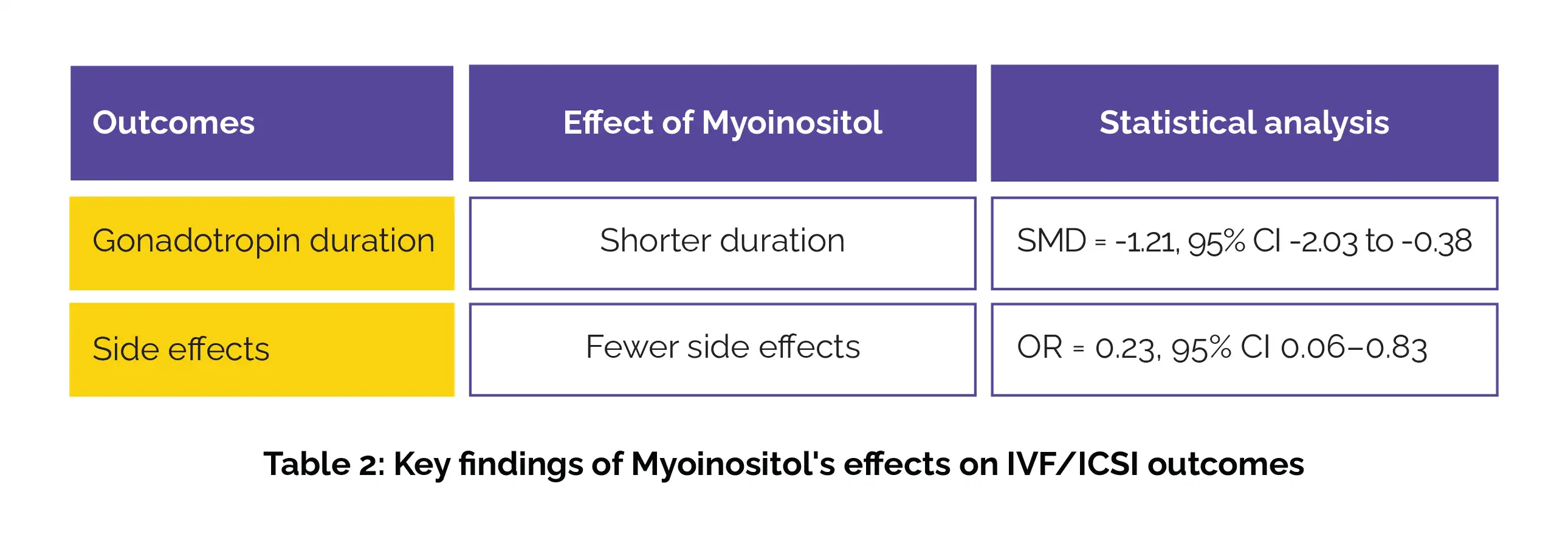 Compared to the controls, the network meta-analysis revealed no substantial disparities in pregnancy outcomes for these treatments. Myoinositol was associated with a shorter gonadotropin duration and fewer side effects compared to controls (Table 2):