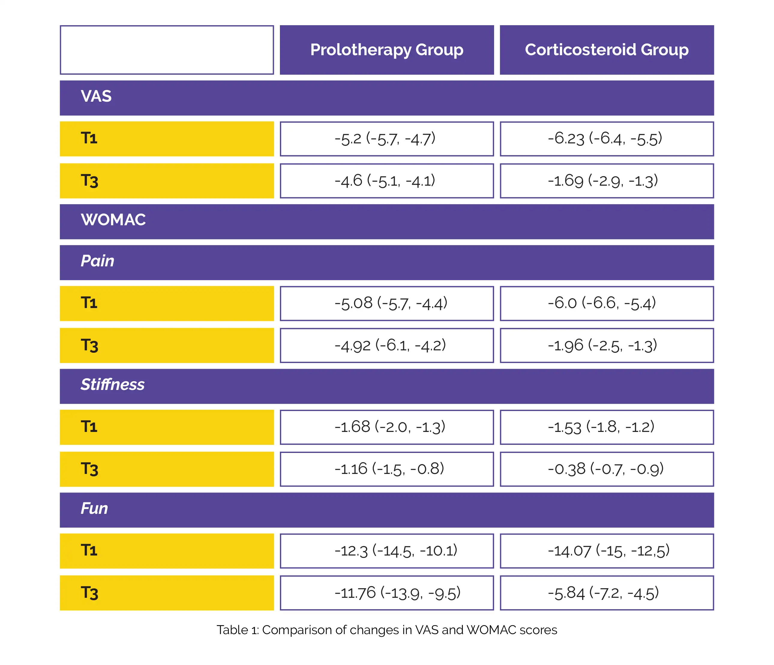 Both therapies significantly reduced pain (assessed by visual analog scale [VAS]) and Western Ontario and McMaster Universities Arthritis (WOMAC) (all of its components) at 1 and 3 months post-intervention compared to pre-treatment. The corticosteroid group exhibited superior pain reduction in the first month. The prolotherapy group showed substantially higher improvements in the VAS and WOMAC components in the third post-intervention month (Table 1).