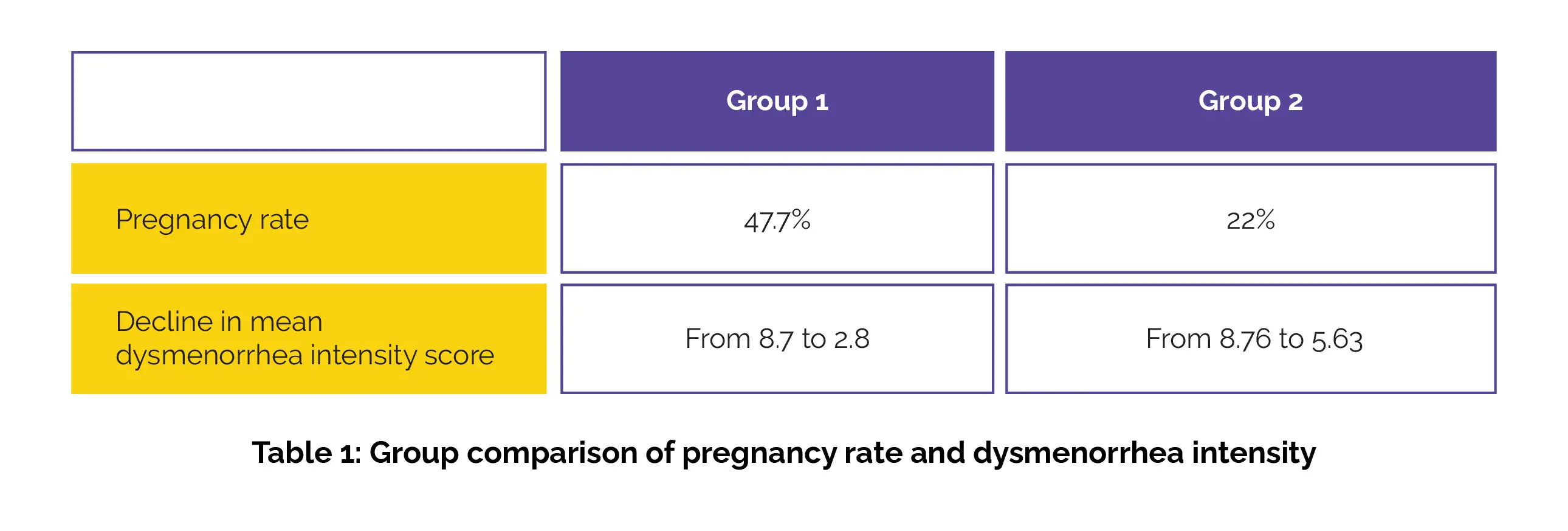 The pregnancy rate in Group 1 was markedly greater than in Group 2  Additionally, women in Group 1 reported a better reduction in dysmenorrhea intensity when compared to Group 2, as shown in Table 1: