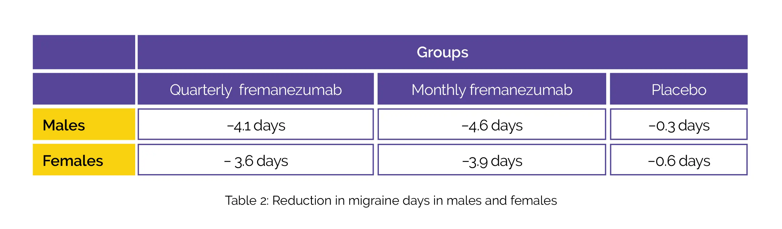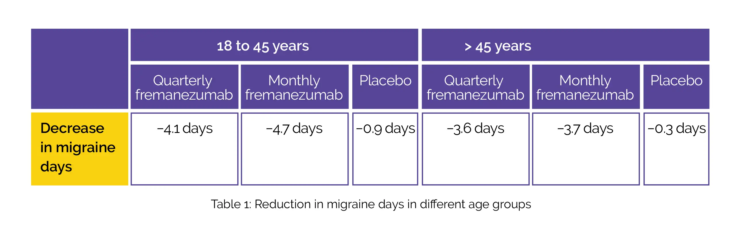 The patients who fulfilled the eligibility criteria were randomized to receive quarterly fremanezumab, monthly fremanezumab, or placebo for 12 weeks. The variation from starting in monthly migraine days and other secondary outcomes in pre-defined age (18–45 years and more than 45 years) and sex subgroups were assessed.