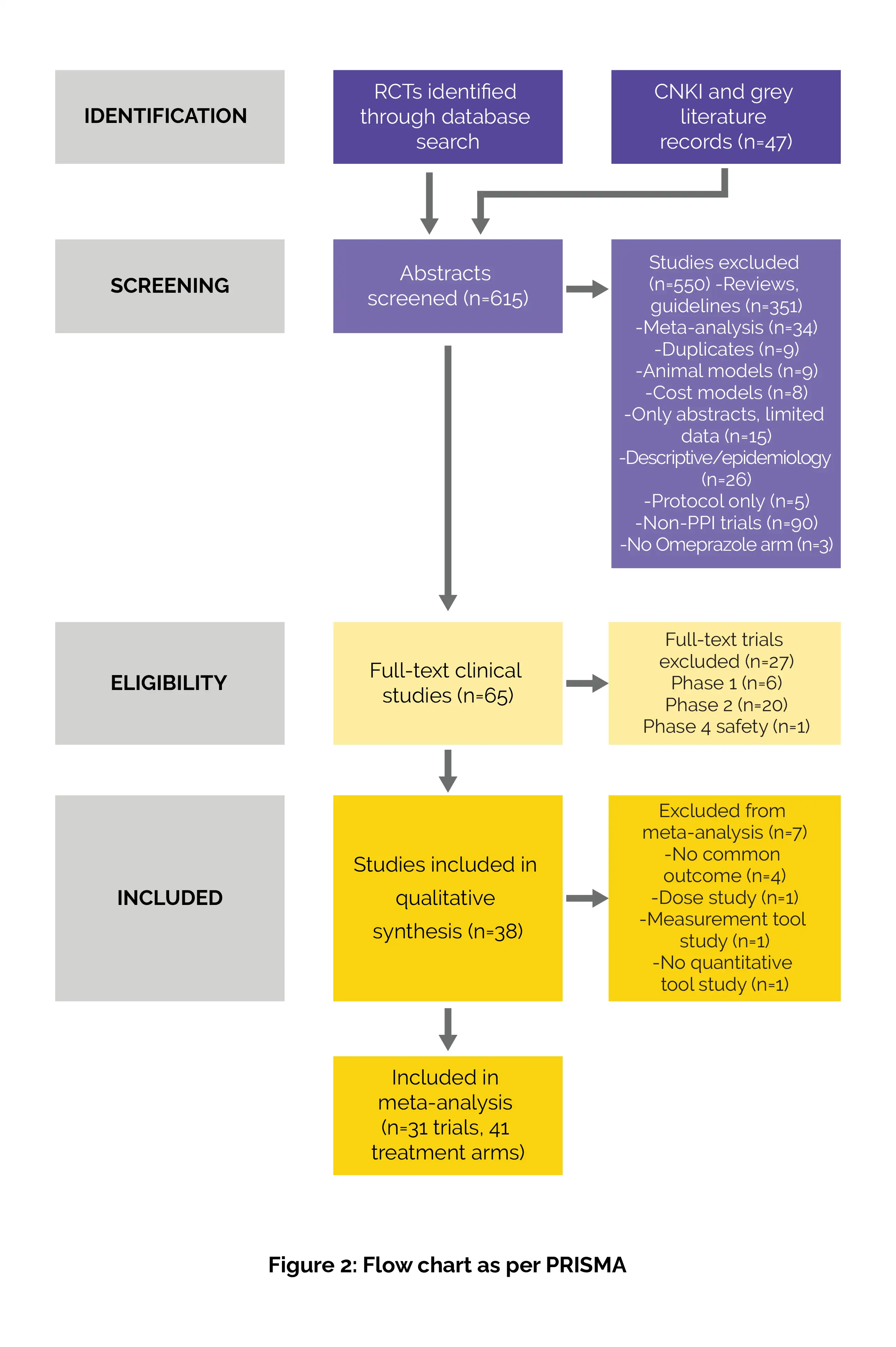 • Trails with a high risk of bias were impeded by the lack of blinding due to different formulation of PPI controls from Omeprazole.