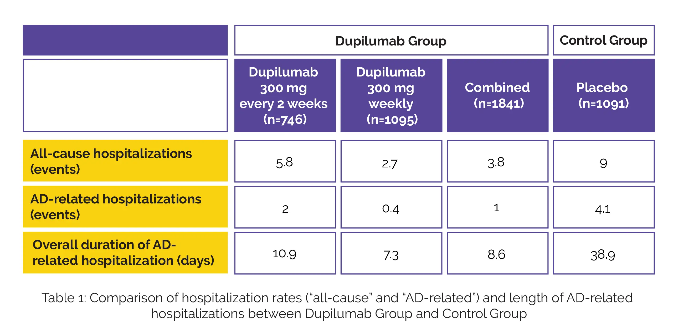 The above findings suggest that moderate-to-severe AD patients who were given dupilumab showed reduced rates of all-cause hospitalizations and shorter hospitalization duration when compared to placebo.