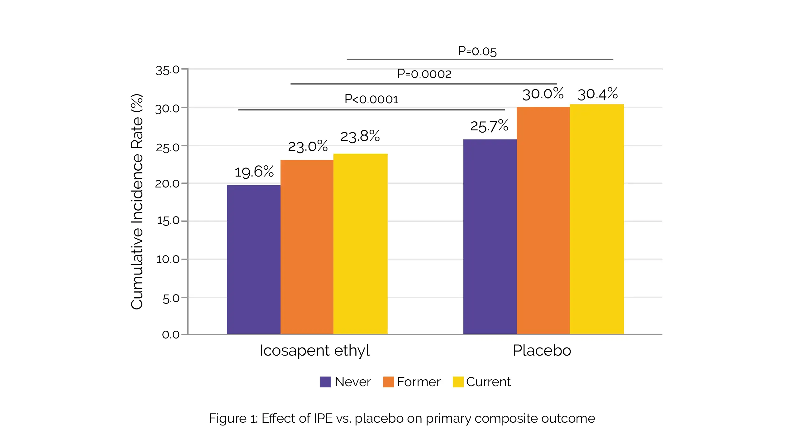 The primary endpoint [death due to CVD, non-fatal myocardial infarction (MI) and stroke, coronary artery revascularization, or hospitalization for unstable angina] lowered by 25% with the use of IPE. Also, IPE therapy was linked with noteworthy reductions in time to the primary composite endpoint (hazard ratio: 0.77) and in overall events (rate ratio: 0.71) in existing plus previous smokers (total number of people, n = 4913).