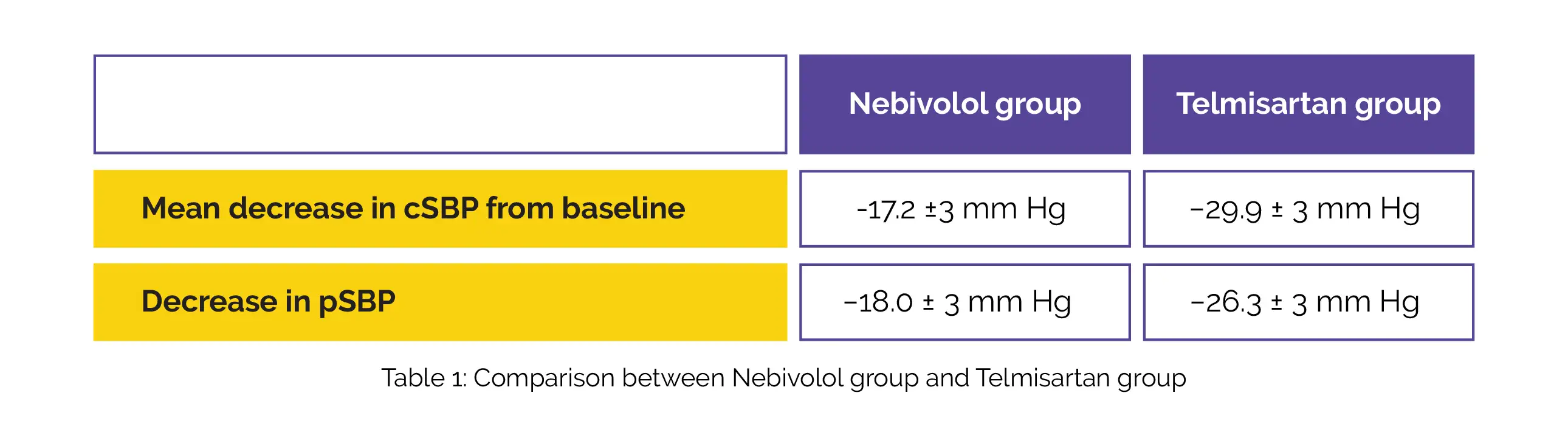 This prospective, multicentre, open-label, randomized controlled trial determined if Nebivolol-based hypertension treatment may offer benefits over Telmisartan in minimizing central blood pressure (CBP).