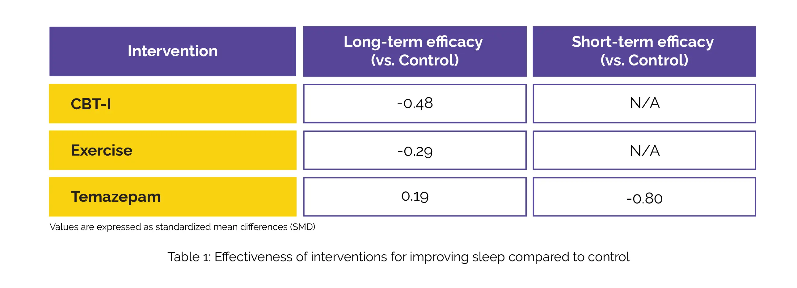 The study encompassed thirteen trials. Following an average follow-up period of 10.3 months post-intervention, both CBT-I and exercise exhibited greater long-term efficacy in improving sleep in comparison with the control group. The sole pharmacotherapy incorporated, Temazepam, demonstrated superior treatment efficacy but did not show enhanced long-term efficacy in comparison with the control (Table 1).