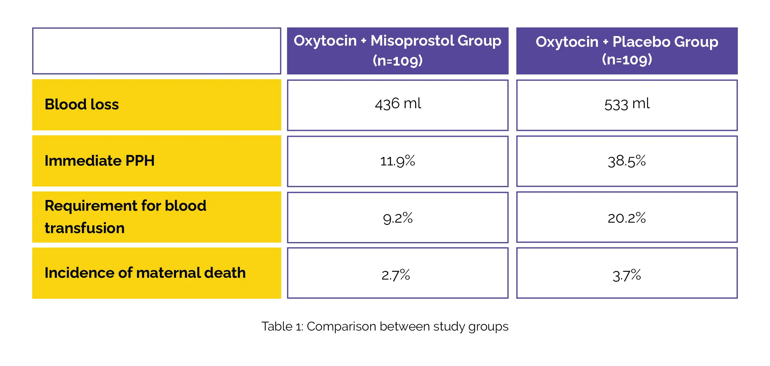 Upon analyzing the data, it was observed that patients who received Oxytocin + Misoprostol exhibited substantially reduced blood loss and a markedly lower occurrence of immediate PPH compared to those who received Oxytocin + Placebo. The requirement for blood transfusion was also notably lower in the Oxytocin + Misoprostol group. Nevertheless, the incidence of maternal death was similar between both groups, as shown in Table 1: