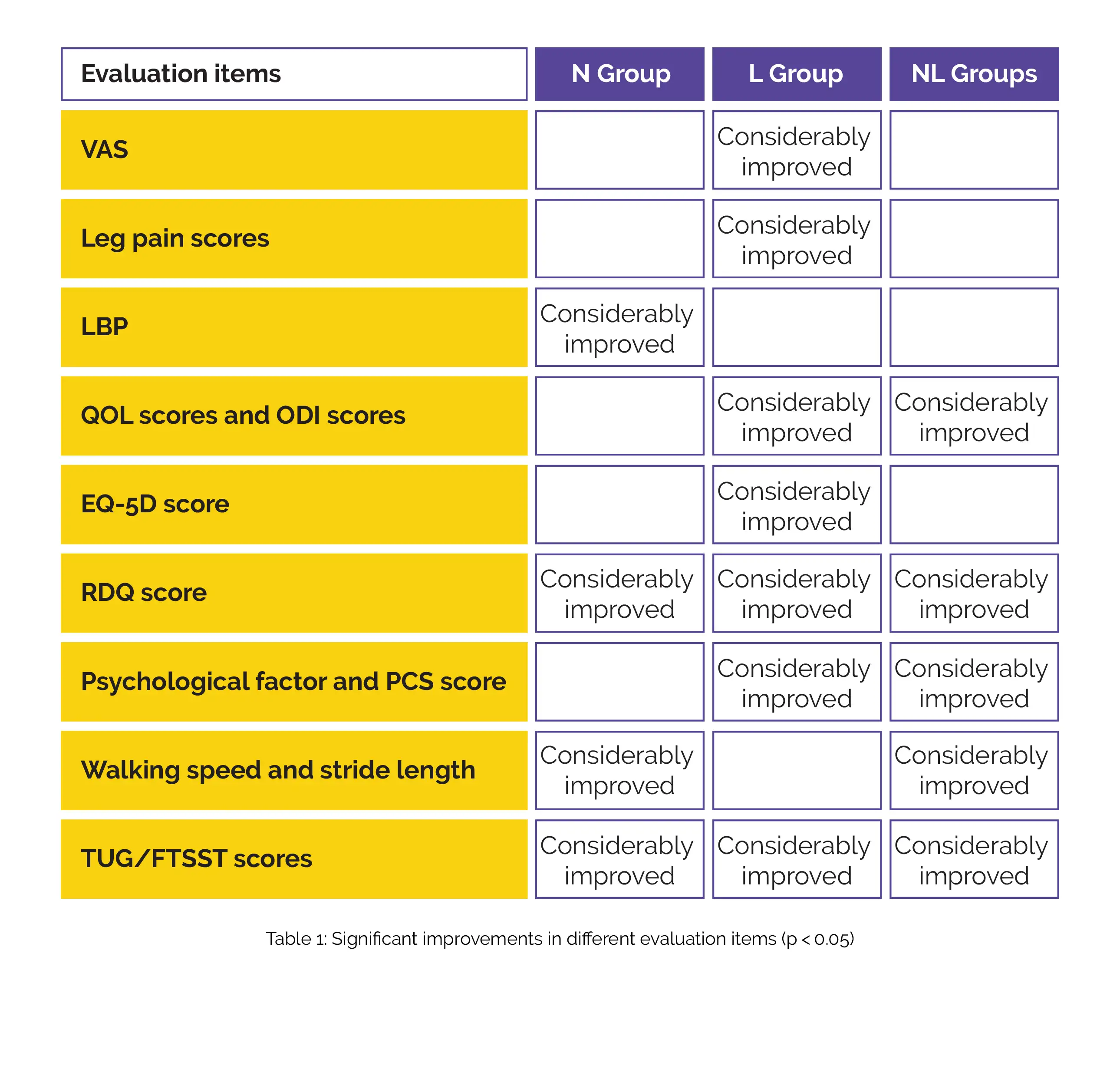 No significant changes in patient characteristics, simultaneous use of painkillers, baseline VAS score, gait balance, or QOL-related scores were found. Considerable improvements in different evaluation items have been shown below (Table 1):