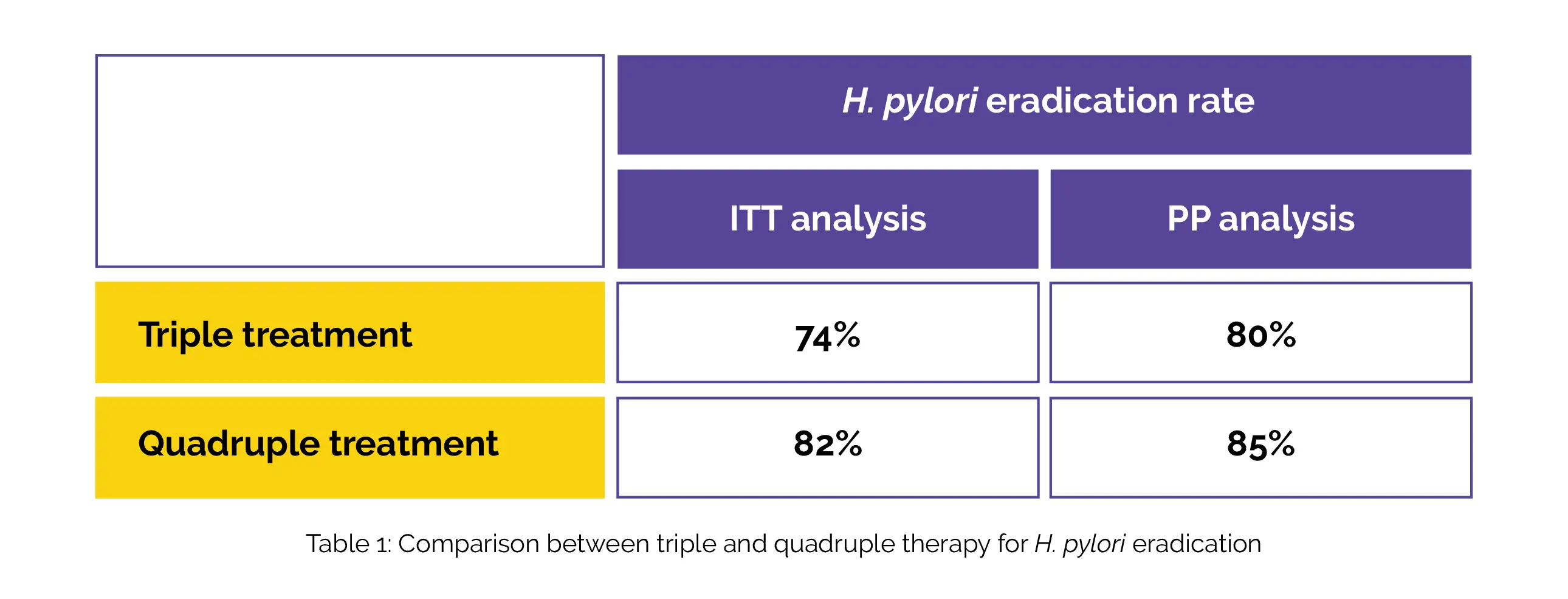 As a first-line treatment for H. pylori disease, quadruple therapy has superior efficacy than triple therapy. But, in the second-line treatment, the efficacy of both regimens is almost comparable.