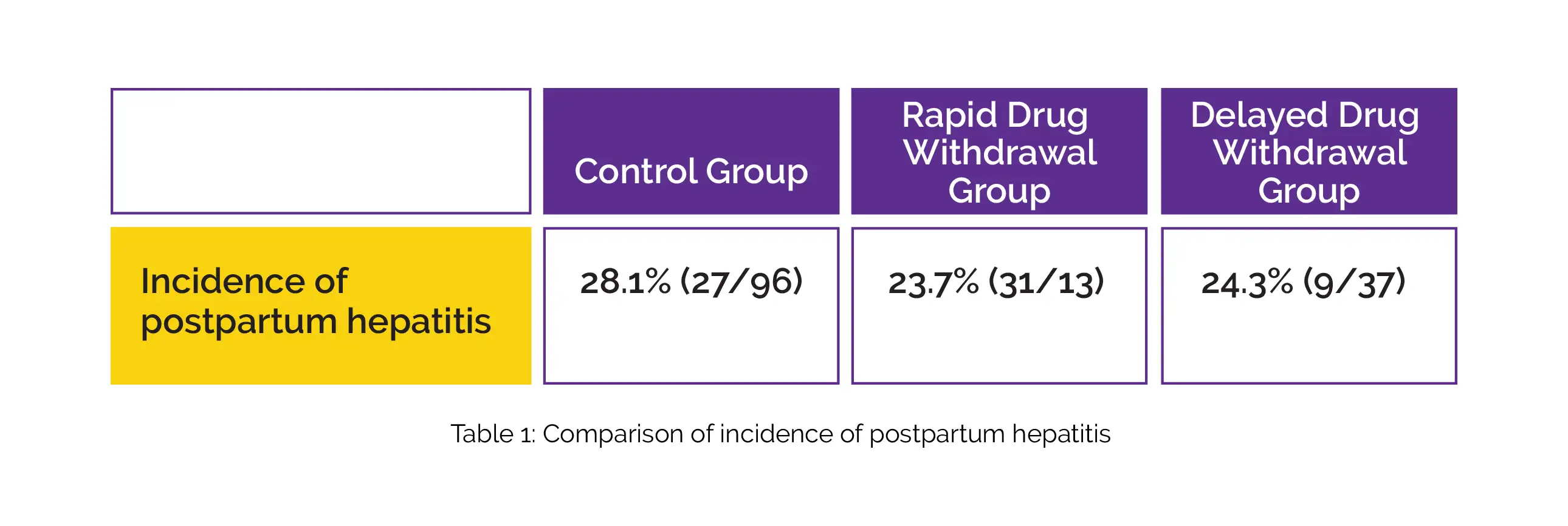 There was no evidence that any factor contributed to the prevalence of postpartum hepatitis. Within 12 weeks post-delivery, 96.3% of postpartum hepatitis in the control group and 92.3% of postpartum hepatitis in the immediate drug withdrawal group occurred. Postpartum hepatitis was more common in the delayed drug withdrawal group, occurring in 77.7% of cases within 12 weeks after birth.