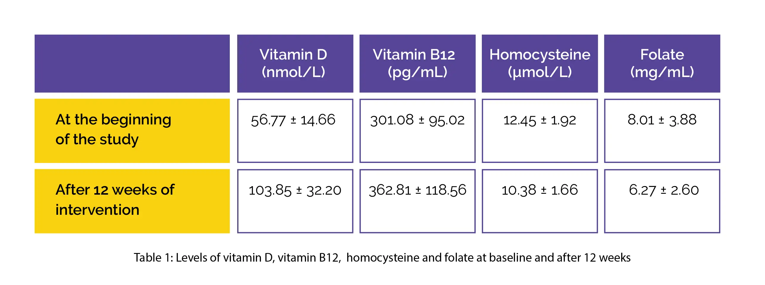 Vitamin D supplementation led to remarkable improvements in the severity of clinical features with most of the people (n = 25 or 62.5%) exhibiting only mild clinical form of the disease. Following 12 weeks of intervention, a considerable rise in the serum levels of vitamin D and vitamin B12 and a drop in the serum levels of homocysteine and folate were noted when compared to the levels estimated at baseline, as shown in Table 1: