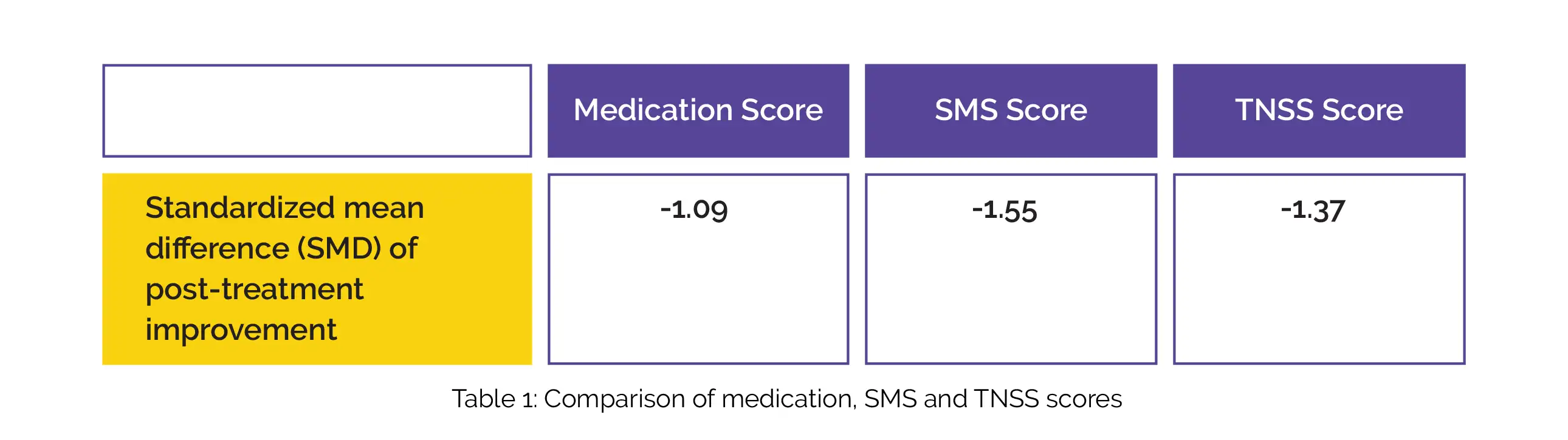 Compared to the control group, the LNIT group had greater post-treatment improvement in medication, SMS and TNSS scores as depicted in Table 1: