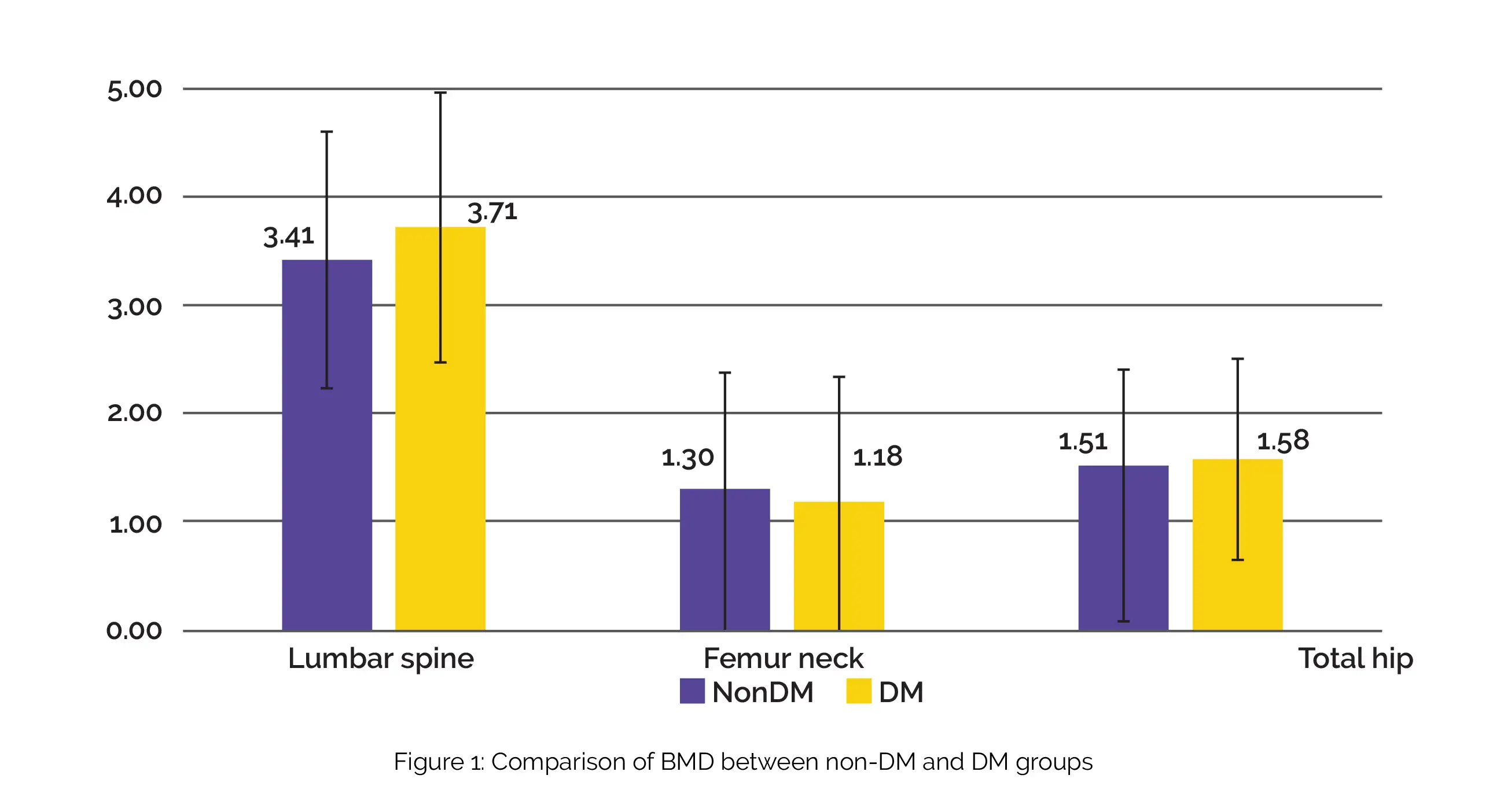 Postmenopausal women suffering from osteoporosis with or without diabetes were recruited and segregated into non-diabetes mellitus (Non-DM) group and diabetes mellitus (DM) group. Both the groups were administered 150 mg ibandronate orally once a month for a year. Assessment of trabecular bone score, procollagen type 1 N-terminal propeptide (P1NP), BMD, and serum C-terminal telopeptide of type I collagen (CTx) was done. Treatment-emergent side effects and alteration in glucose metabolism during the use of drug were monitored.