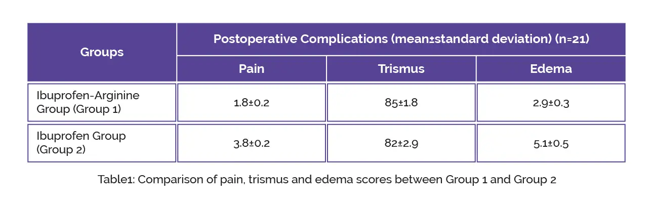 Overall 21 subjects (age 18-30 years) with an impacted, bilateral and symmetric third molar that needed trans alveolar extraction were recruited. Participants were randomly allocated numbers from 1-21 and segregated into two groups. The test group (Group1) was given a single dose of ibuprofen-arginine and the control group (Group 2) was administered only ibuprofen as a preoperative medication. Both groups were given amoxicillin + acetaminophen as a postoperative medication.