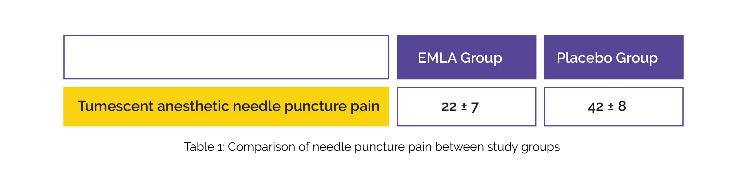 Venous clinical severity score (VCSS), CEAP classification, and baseline demographics were comparable between both groups. Compared to the placebo group, participants in the EMLA group experienced lower tumescent anesthetic needle puncture pain, as depicted in Table 1: