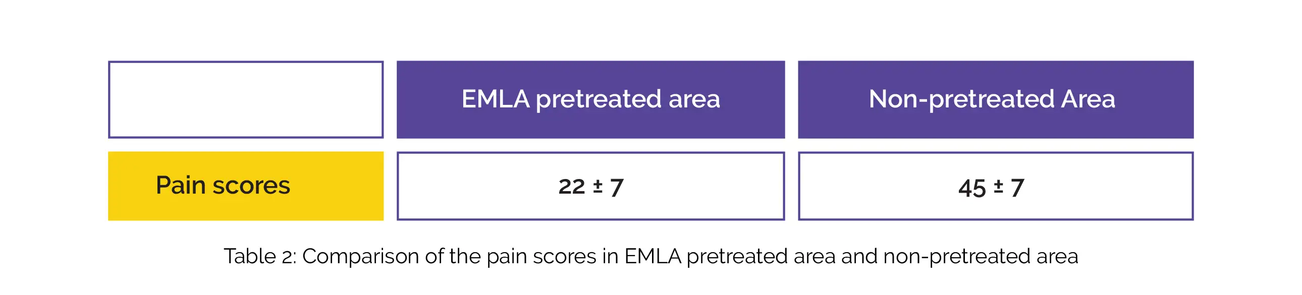 In this study, the pain scores of other time points were reported to be comparable. Compared to the non-pretreated area, lower pain was witnessed in EMLA pretreated area during needle puncture in the same patient, as shown in Table 2: