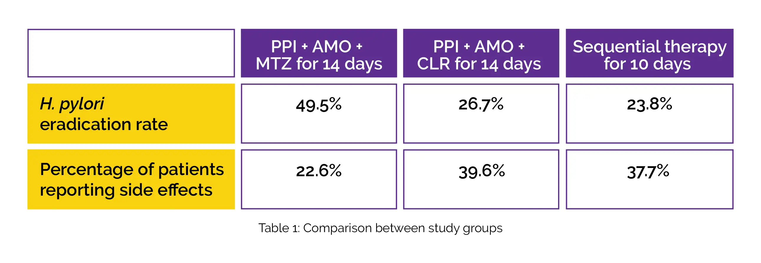 A total of 149 patients were included over an 18-month period. The eradication rate and side effects reported in proton pump inhibitor (PPI) + Amoxicillin (AMO) + MTZ, PPI + AMO + CLR, and sequential therapy, are shown in Figure 1: