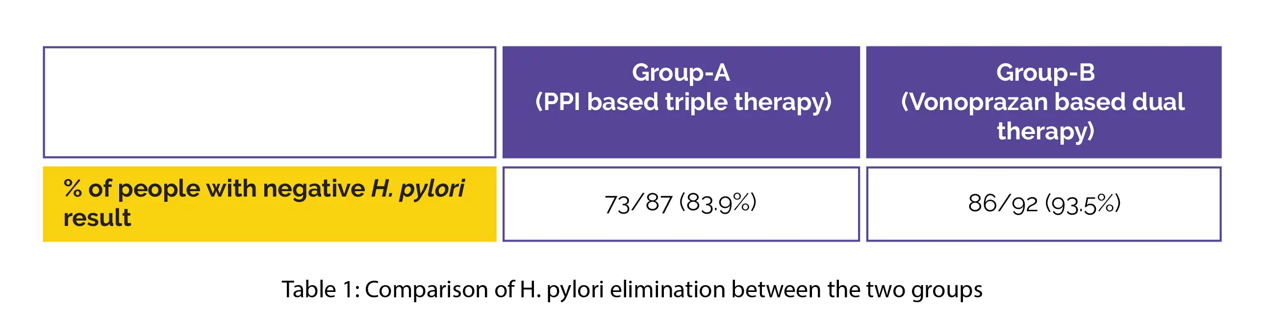 The study included 192 H. pylori-infected people (age 18-75 years) and randomized them into (i) Group-A (n=96): Received 1 gm amoxicillin capsule; 500 mg clarithromycin tablet; 20 mg omeprazole capsule twice daily for two weeks, (ii) Group-B (n=96): Received 1 gm amoxicillin capsule; 20 mg vonoprazan tablet twice daily for two weeks.