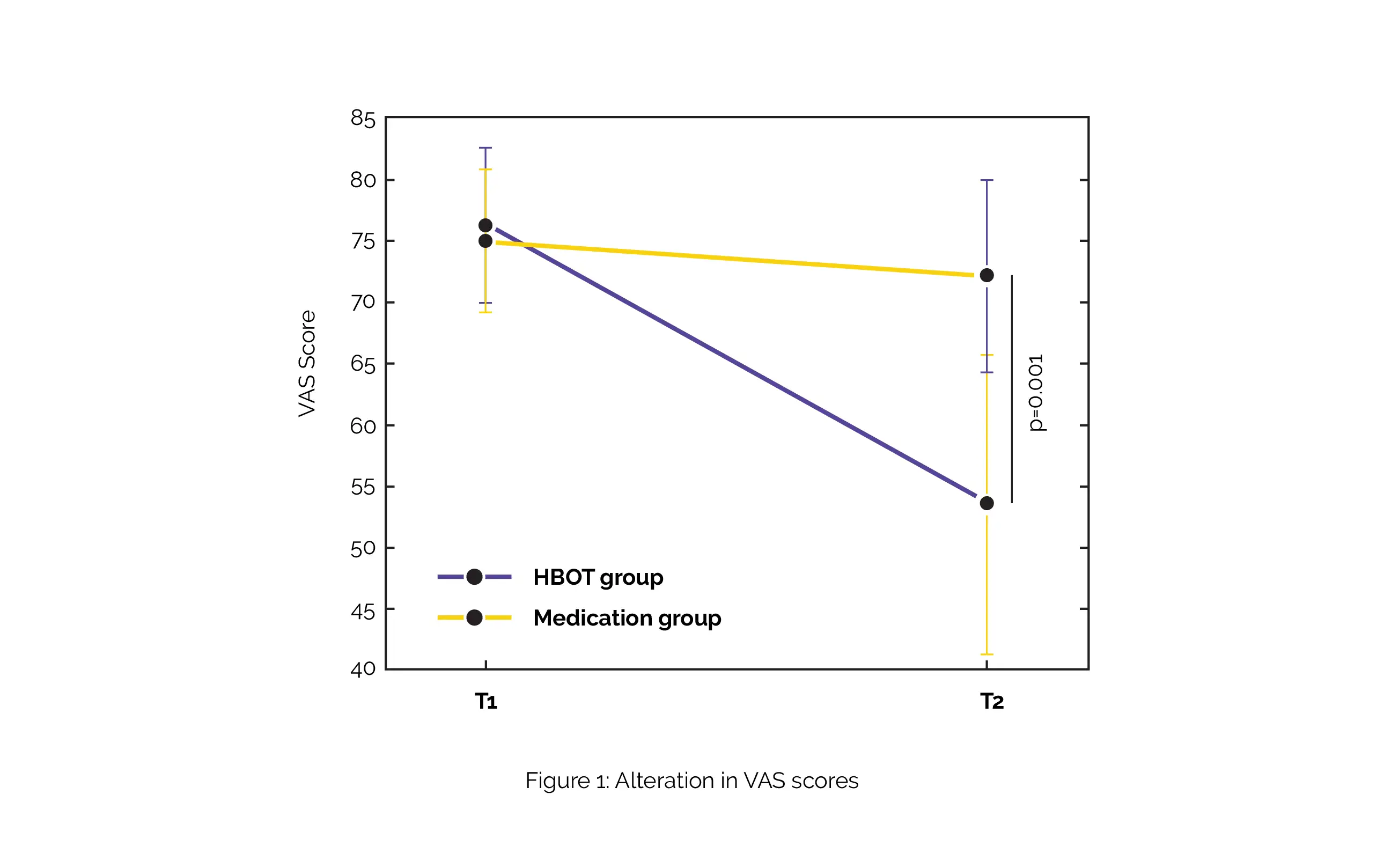 As shown in Figure 1, there was a substantial group-by-time interaction in pain intensity (assessed using VAS) following HBOT contrasted to the medication group, with a considerable net effect size (d = -0.95) in pain intensity decrease post-HBOT in comparison to drugs.