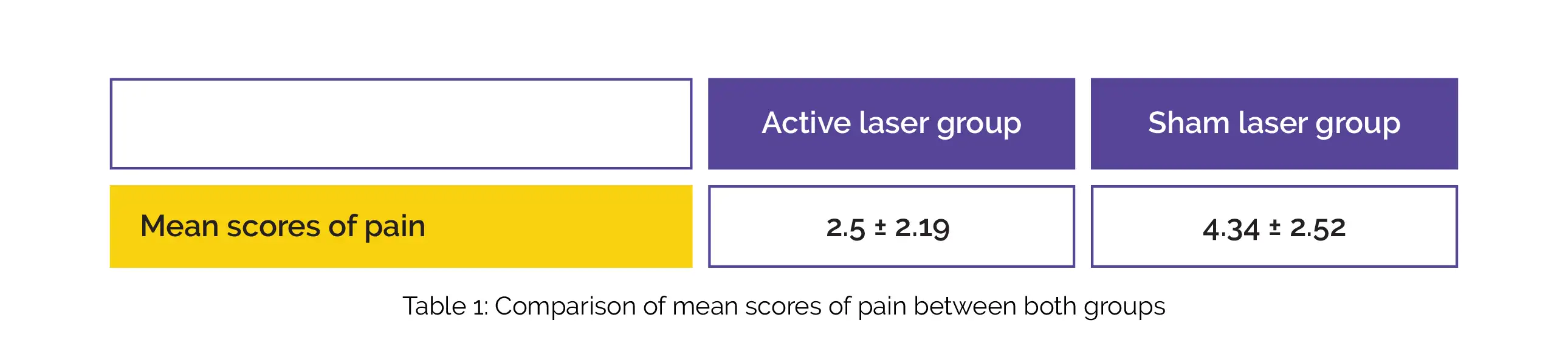 The mean pain scores for sham laser and active laser groups are depicted in Table 1: