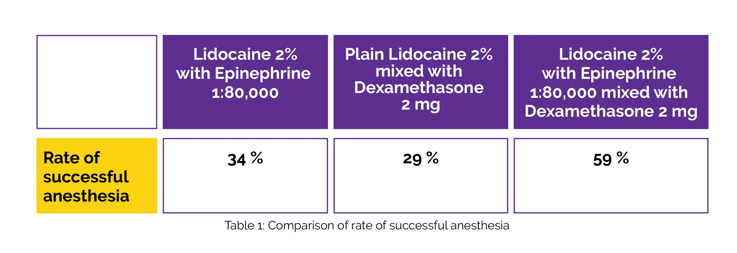 Anesthesia success rates for Lidocaine 2% with Epinephrine 1:80,000, Lidocaine 2% with Epinephrine 1:80,000 mixed with Dexamethasone 2 mg, and Lidocaine 2% (plain) combined with Dexamethasone 2 mg groups are depicted in Table 1:
