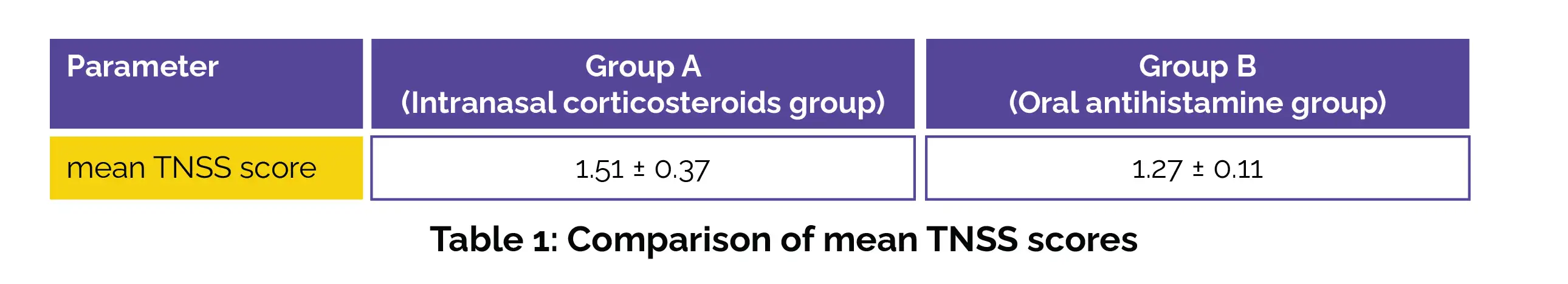 The mean TNSS scores in intranasal corticosteroids and oral antihistamines groups are depicted in Table 1:
