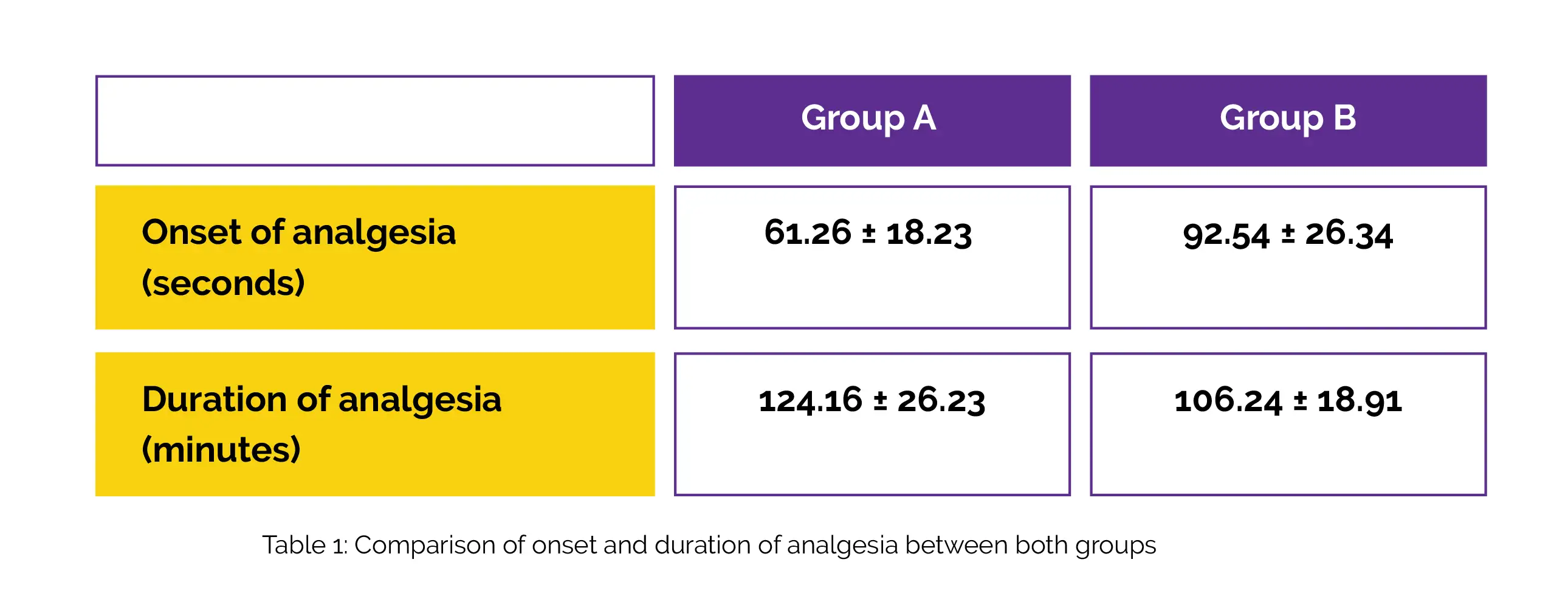 A total of 108 expectant mothers (Group A: 57; Group B: 51) reported having enough analgesia, and 74 had vaginal deliveries (Group A: 41; Group B: 44). Normal vaginal delivery rates were greater in Group B. Group A recorded earlier analgesia onset that continued for greater duration compared to Group B, as shown in Table 1: